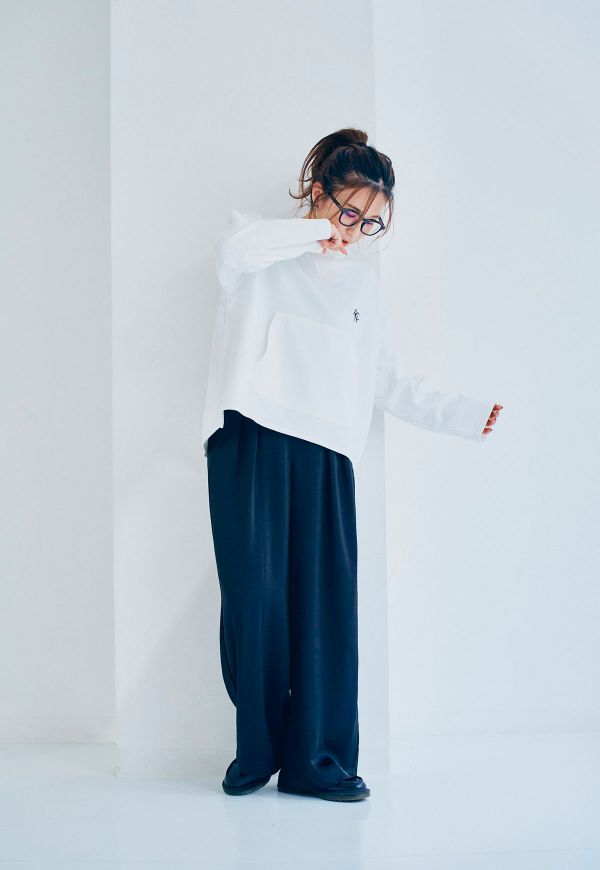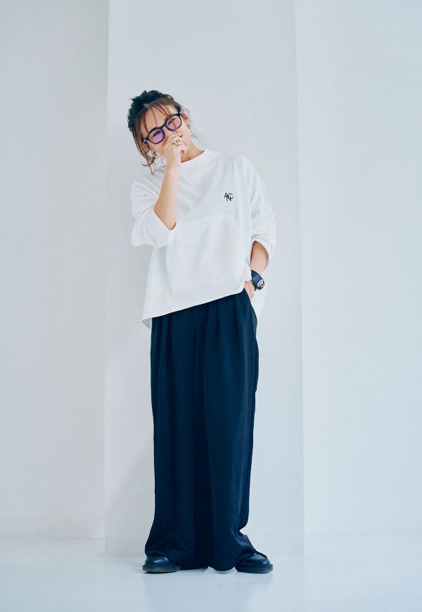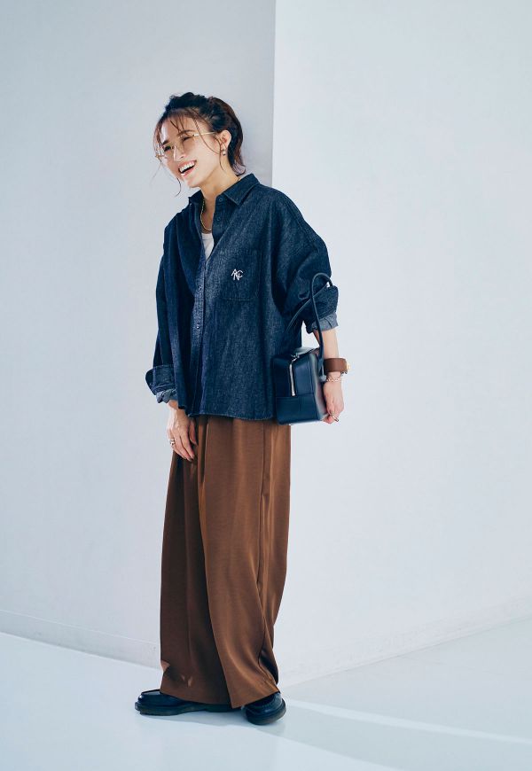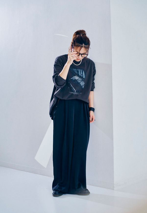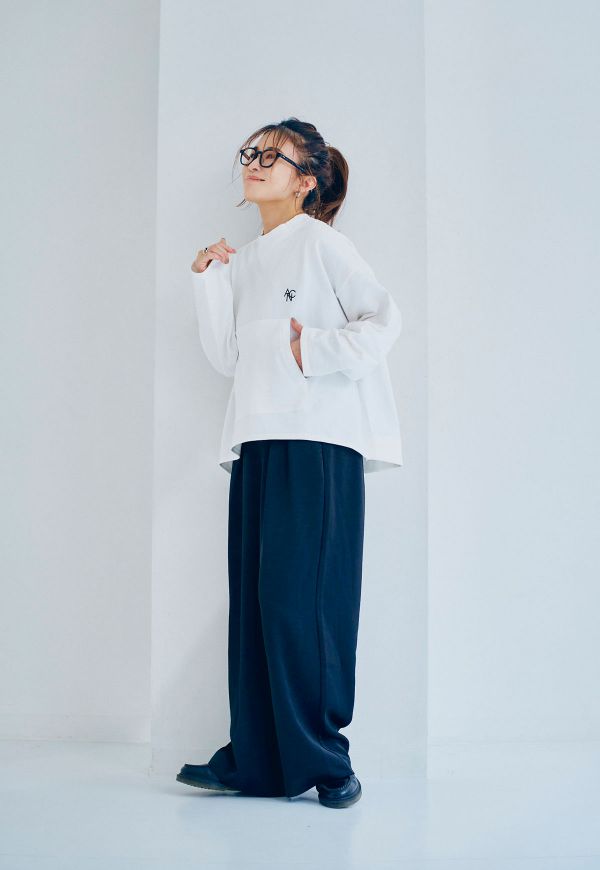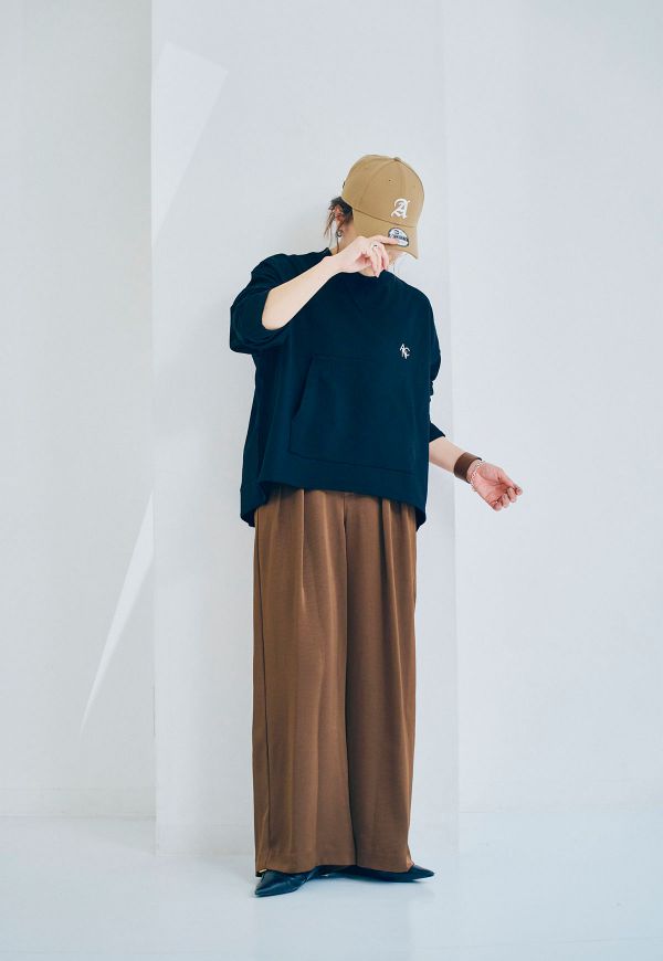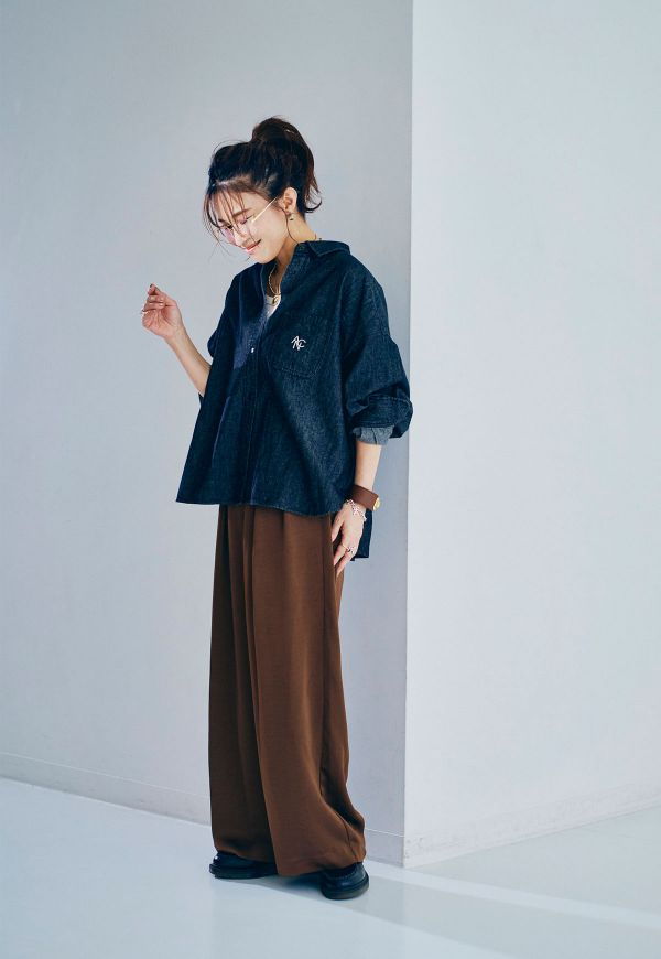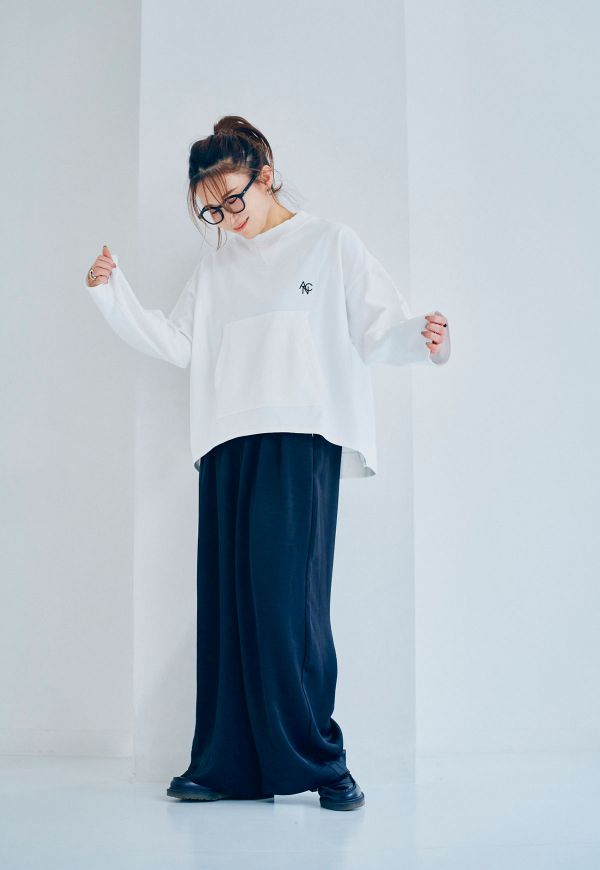 上品な中にもカジュアルさのあるサテン生地のアイテムは、ロンTやスウェットなどカジュアルなアイテムと合わせてカジュアルダウンするのがANIECA流。