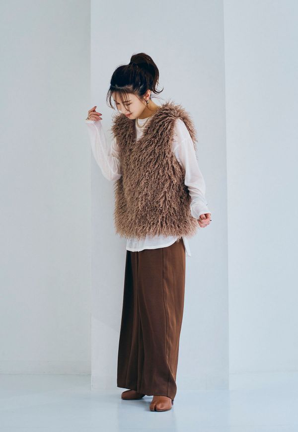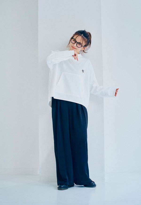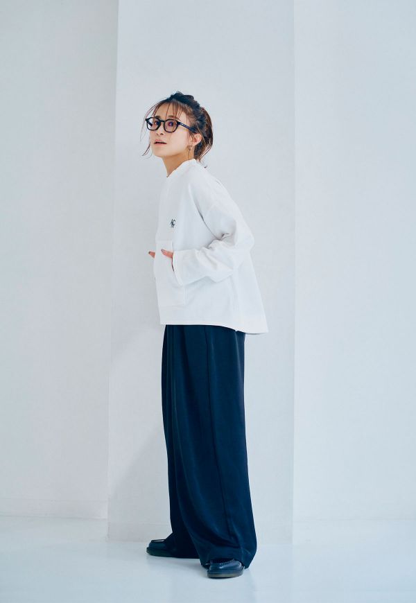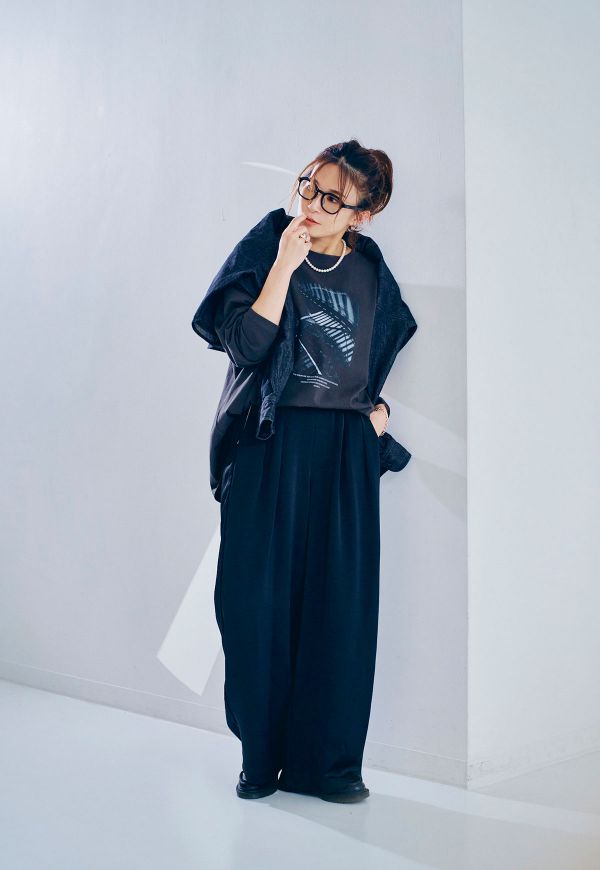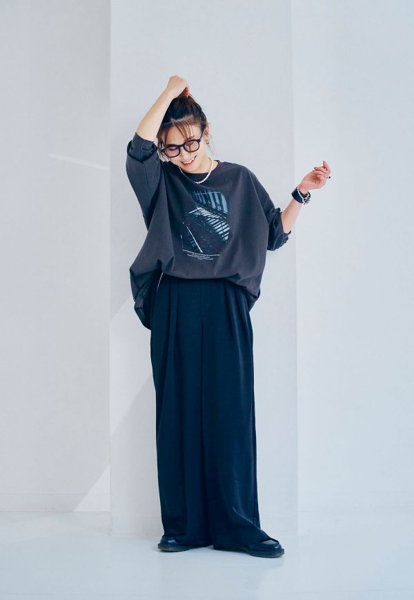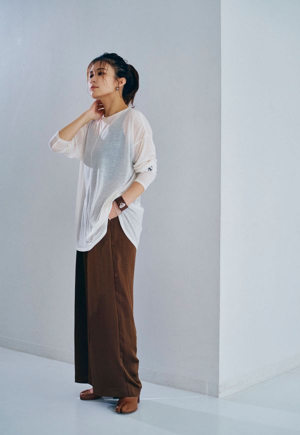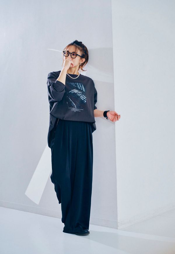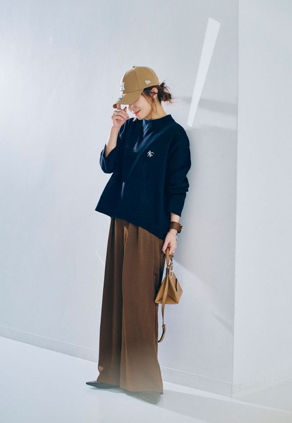 上品な中にもカジュアルさのあるサテン生地のアイテムは、ロンTやスウェットなどカジュアルなアイテムと合わせてカジュアルダウンするのがANIECA流。
