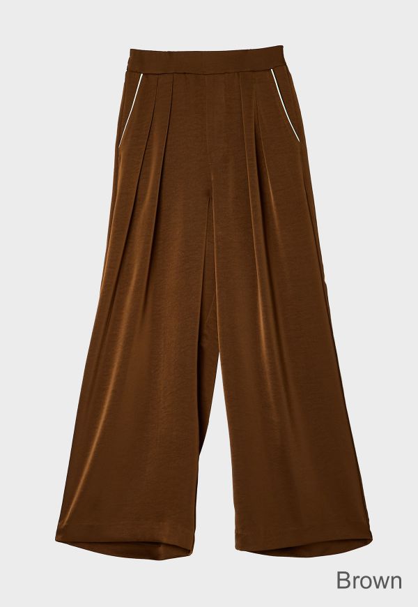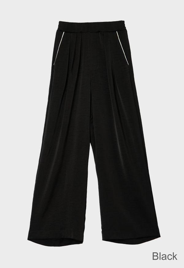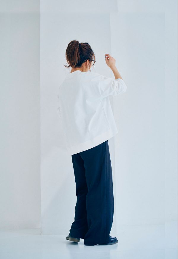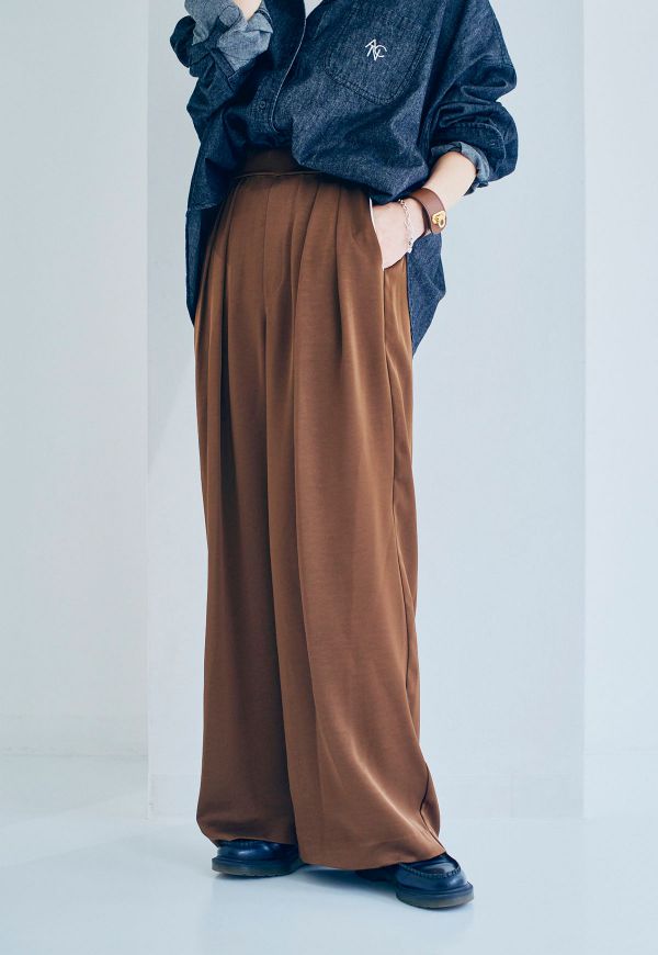 柔らかく肌ざわりの良い、ボトムに適した肉厚のサテンを使用したタックパンツです。程よいゆとりのあるシルエットは、身体のラインを拾いにくく、ウエストもオールゴムの仕様になっているので、着用時にストレスを感じないアイテムです。きちんと感のある素材を使用したリラクシーなパンツです。