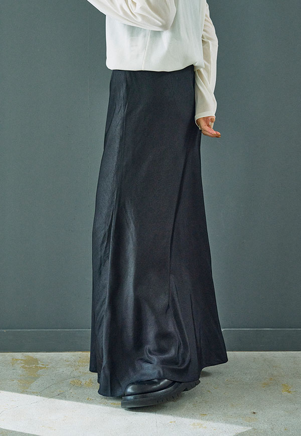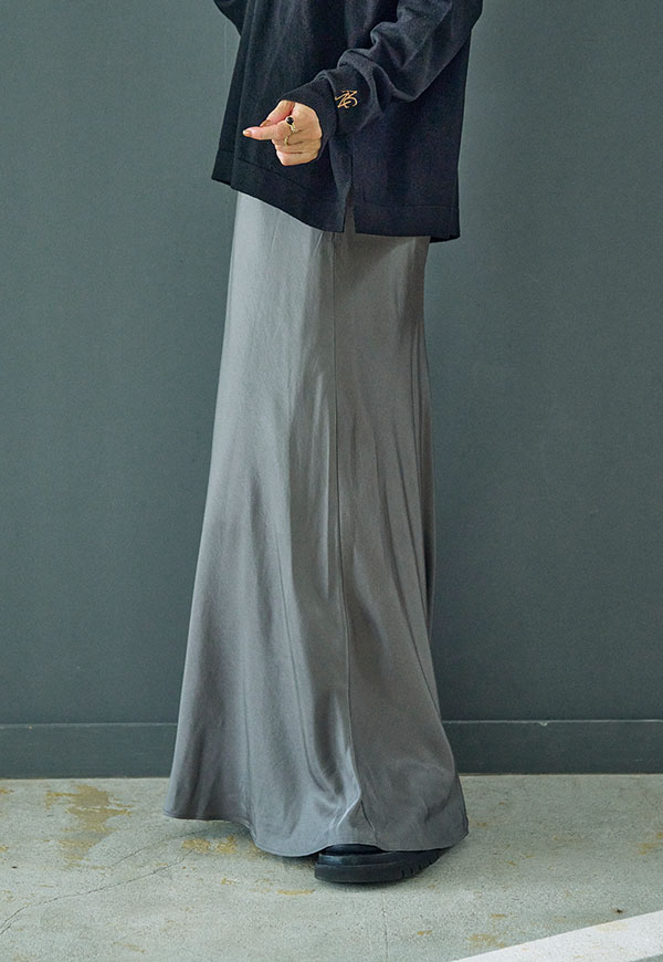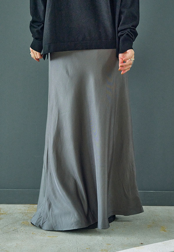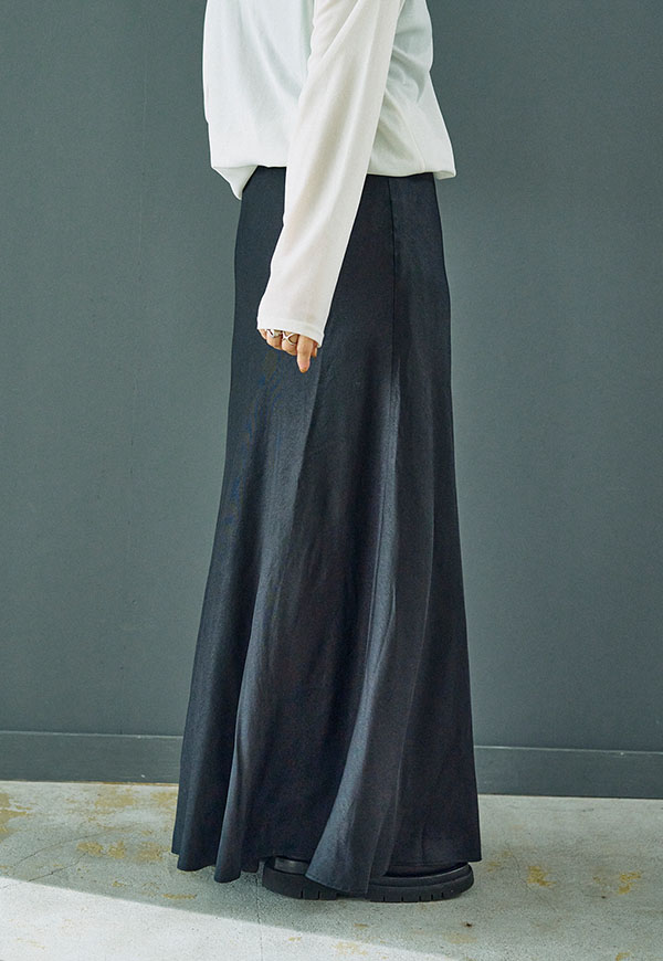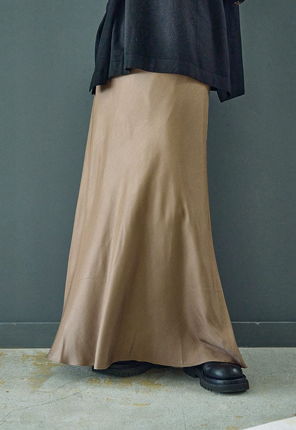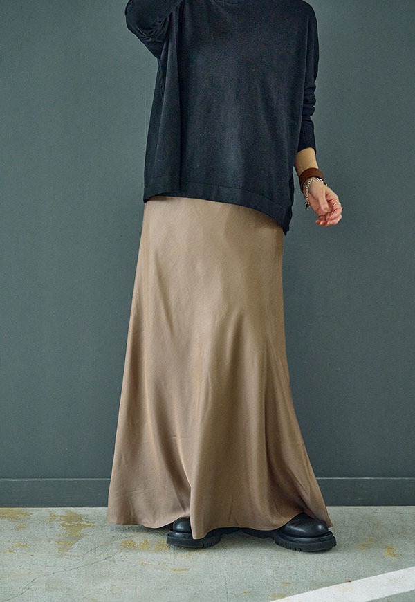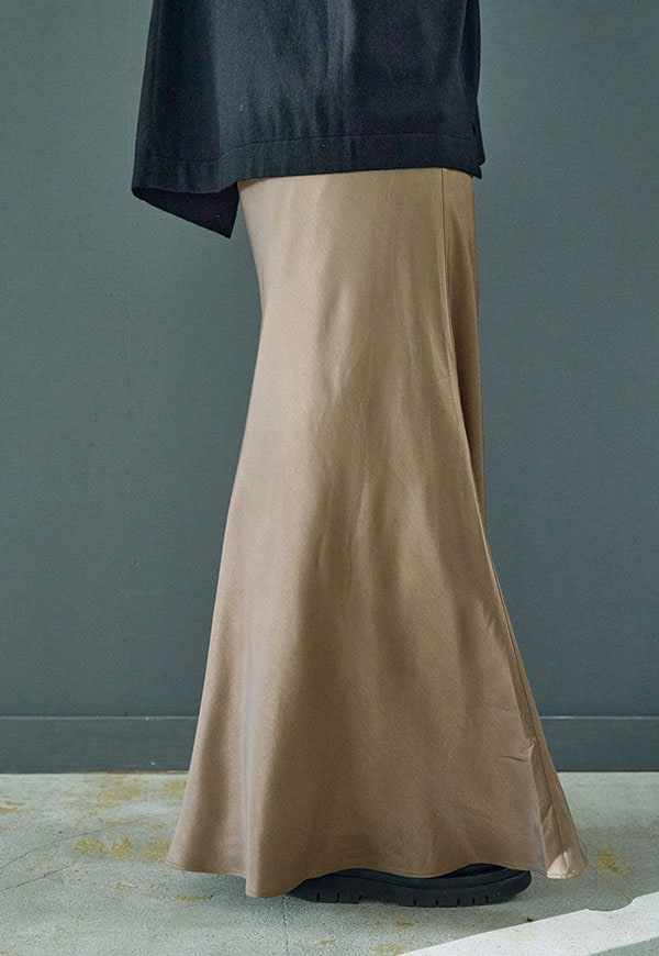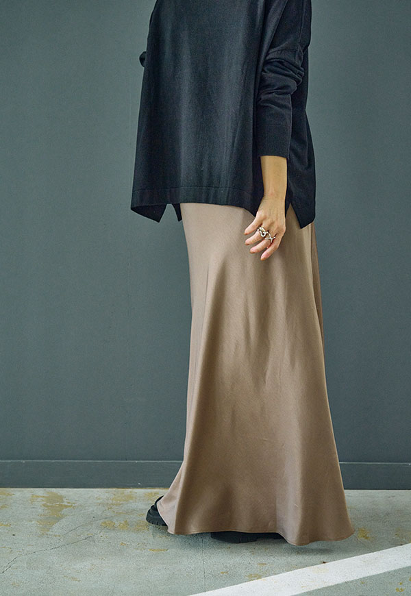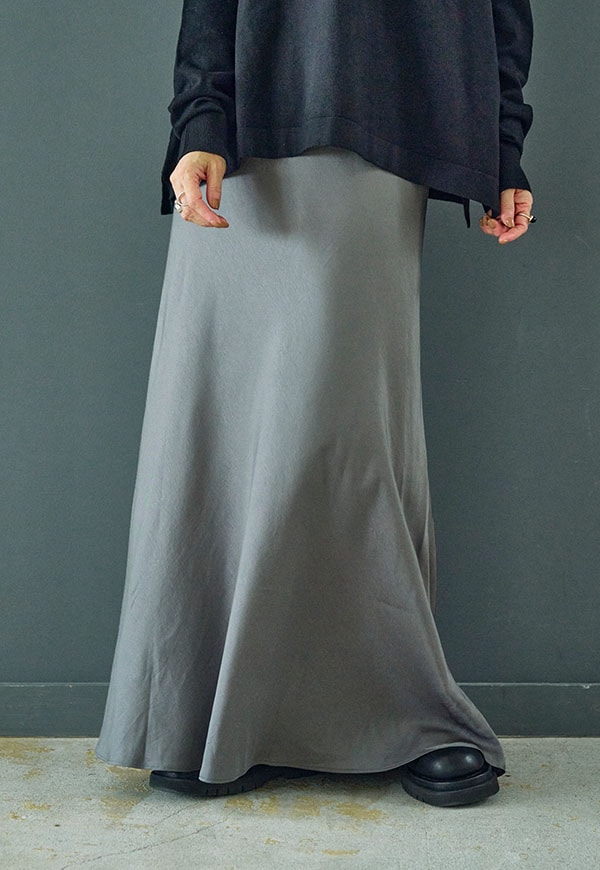 バイアス裁ちによる自然な伸縮性としなやかなフレアシルエットが魅力のロングスカートです。