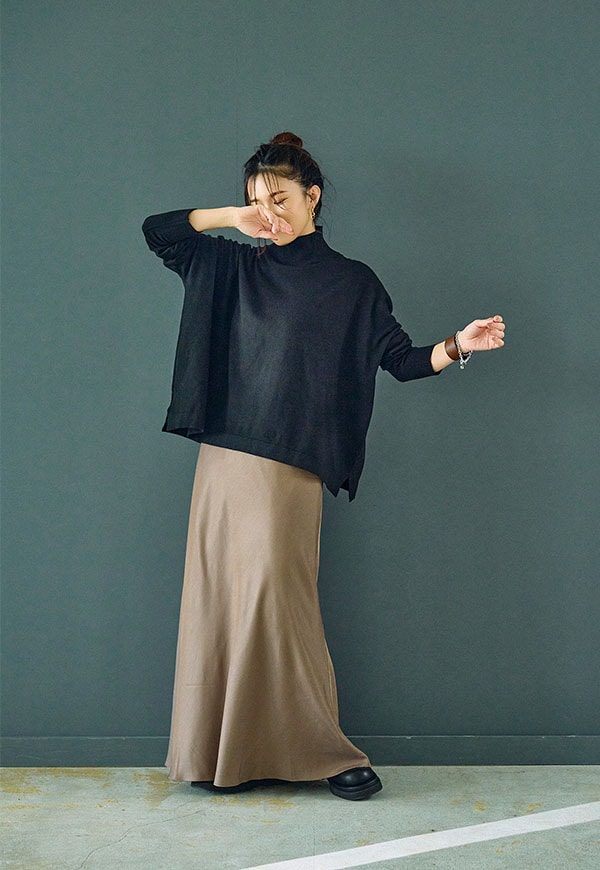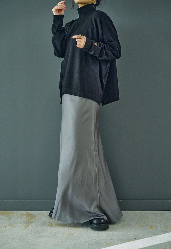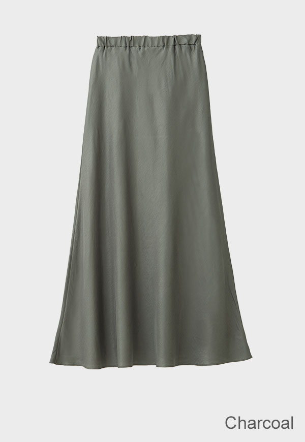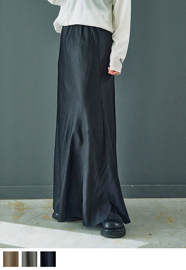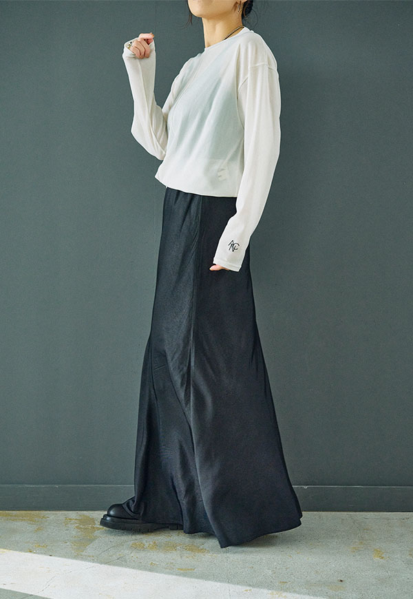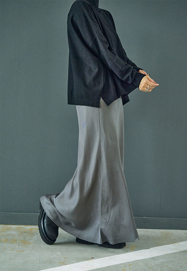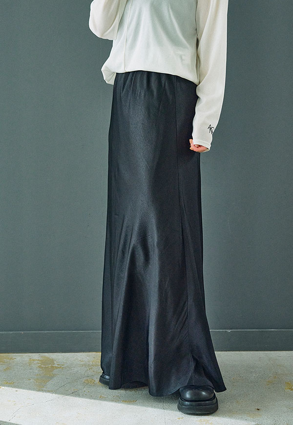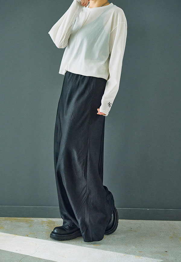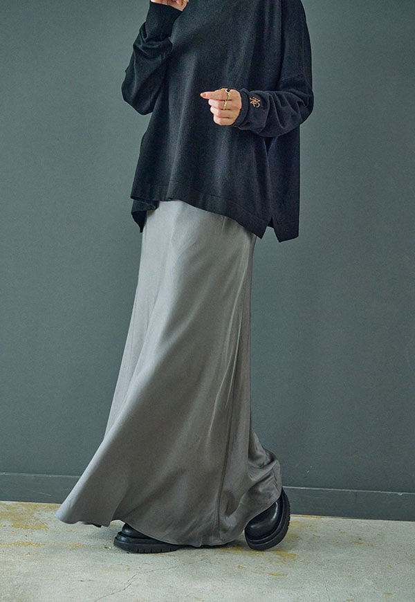 バイアス裁ちによる自然な伸縮性としなやかなフレアシルエットが魅力のロングスカートです。
