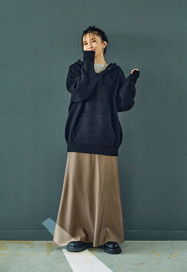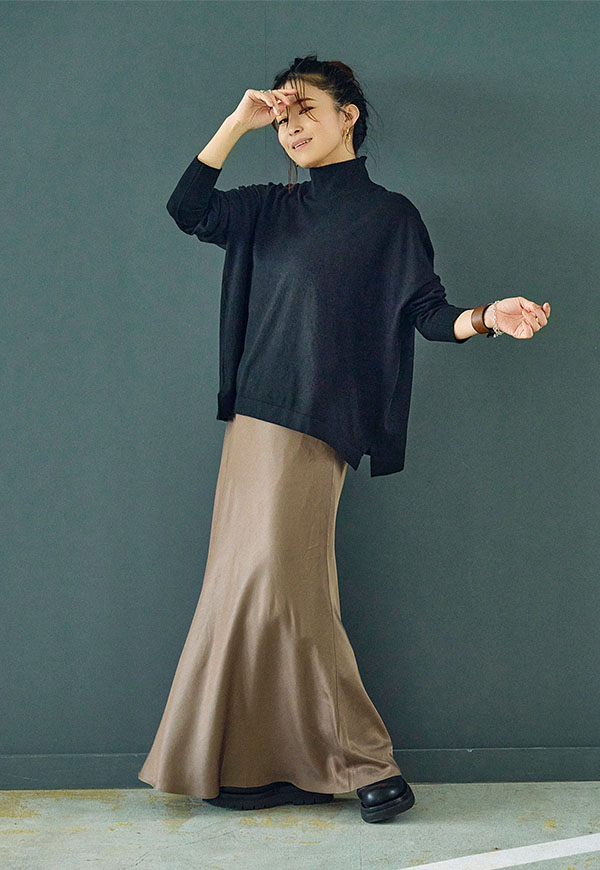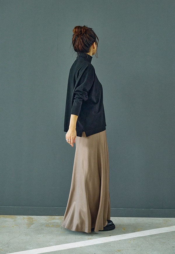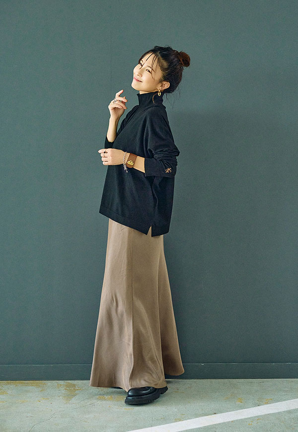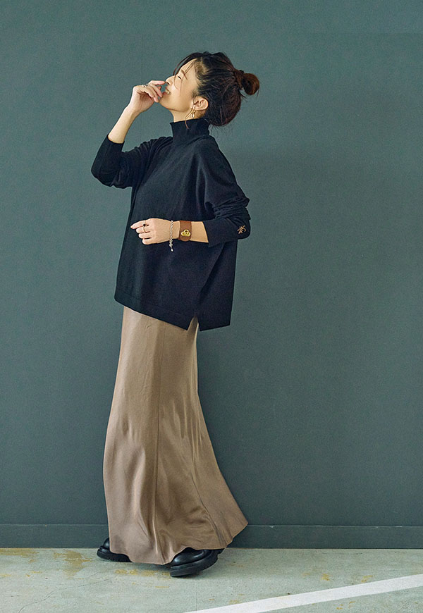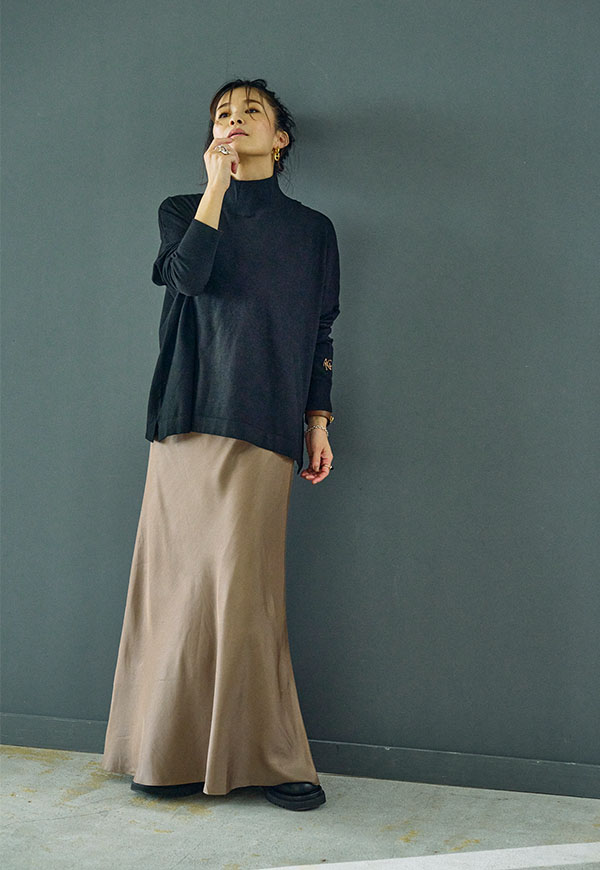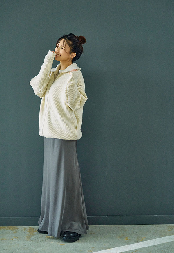 シンプルなデザインだからこそ、ニットやスウェット、ブラウスなど合わせるトップス次第で様々なスタイリングが楽しめる一着です。