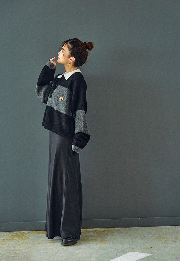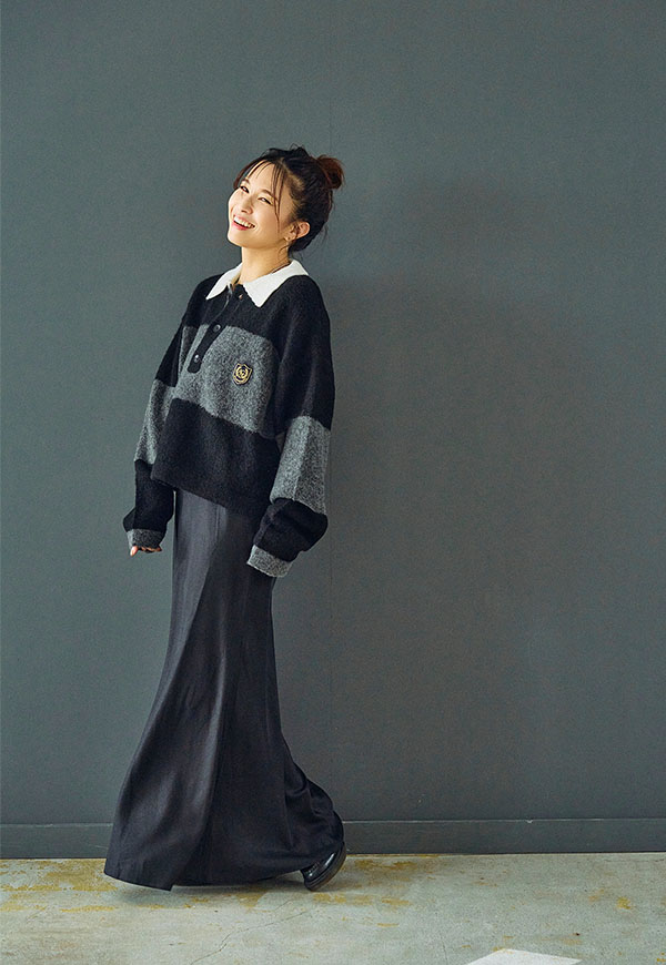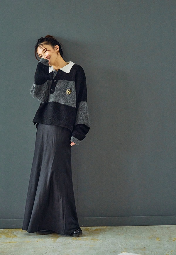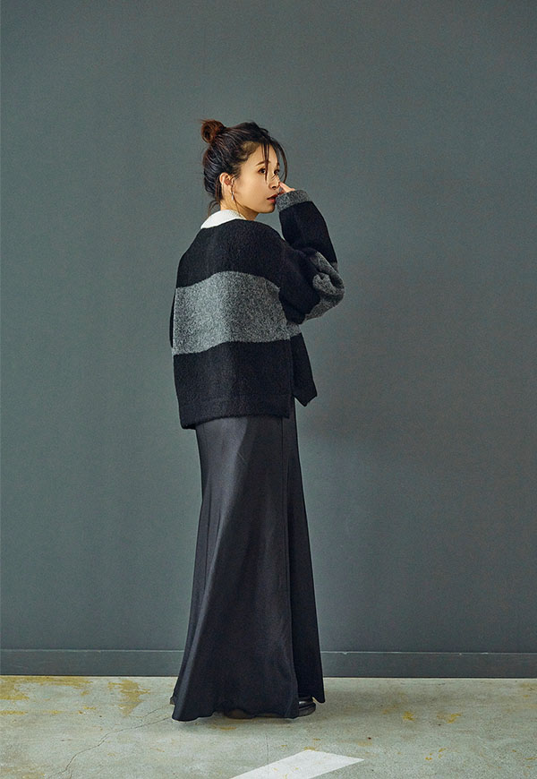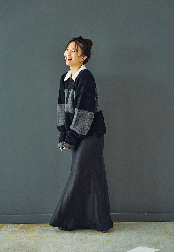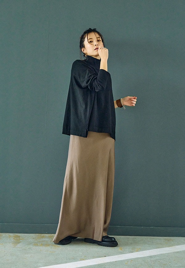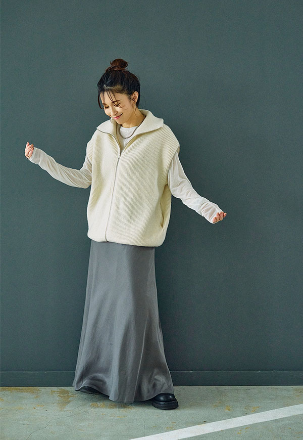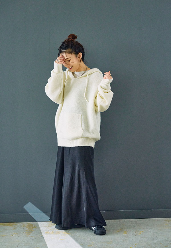 シンプルなデザインだからこそ、ニットやスウェット、ブラウスなど合わせるトップス次第で様々なスタイリングが楽しめる一着です。