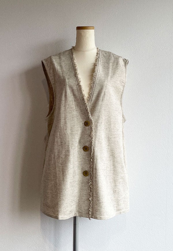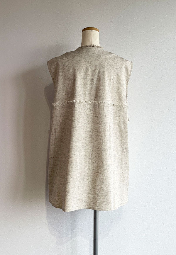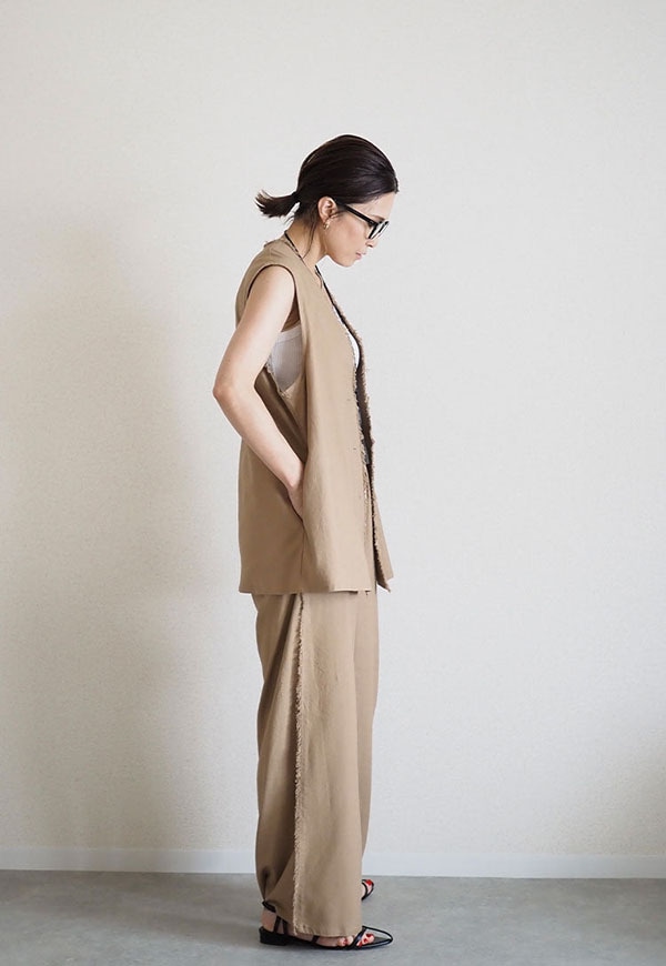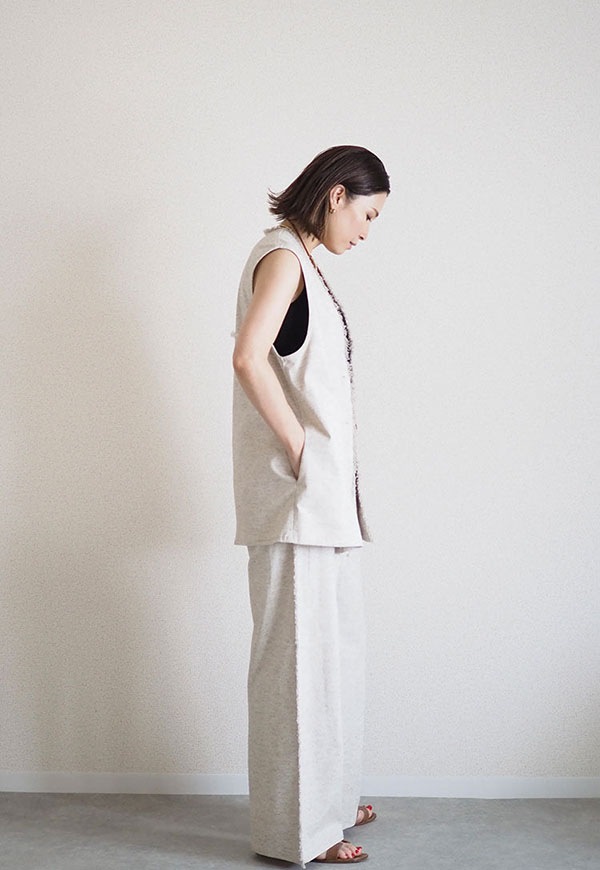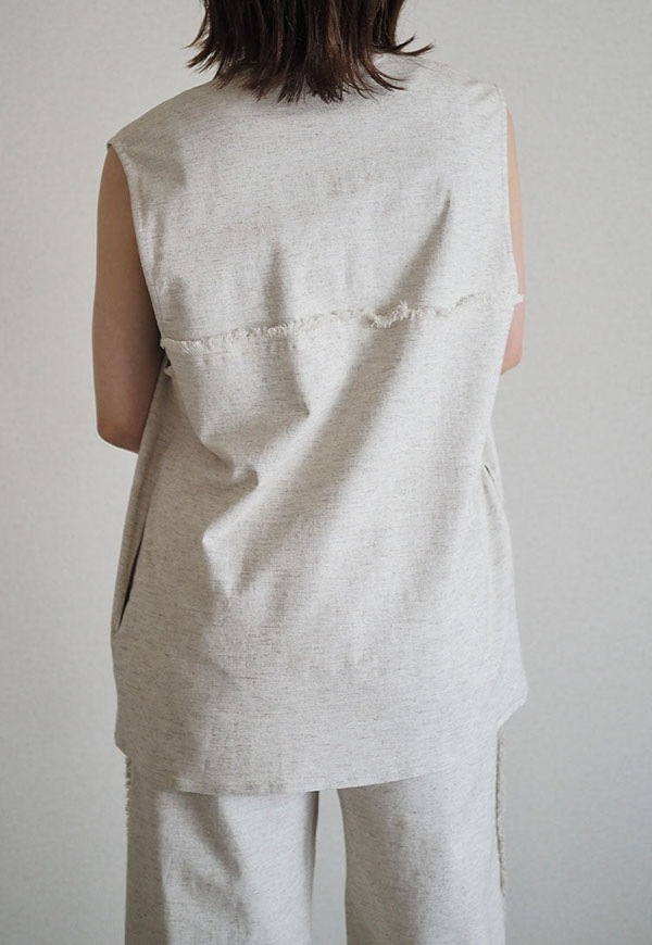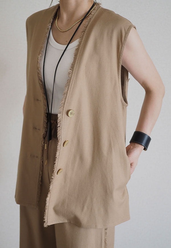 夏はキャミソールやタンクトップの上から秋口はカットソーなどとスタイリングしても◎アーム部分はゆったりとしたサイズ感でワンピースやAラインのシルエットの物にも対応可能です。カジュアルからキレイ目まで幅広いスタイリングを楽しめる万能ITEMです。同素材のパンツとの組み合わせがおすすめです。