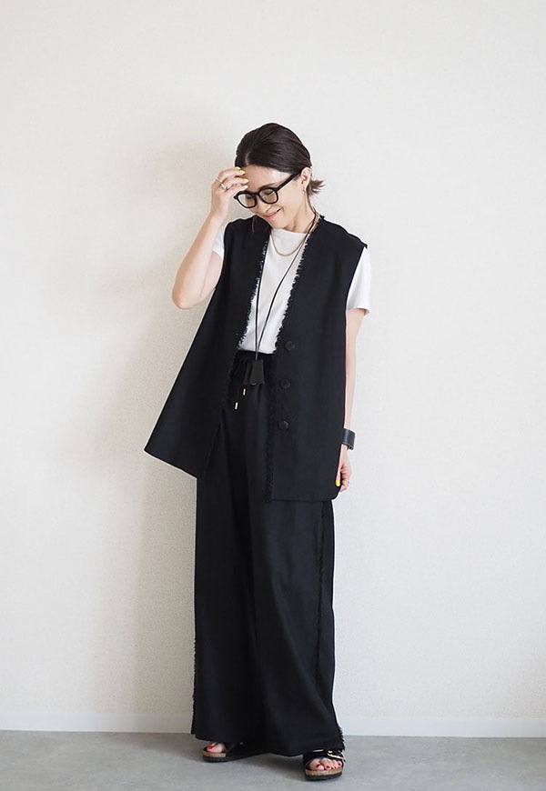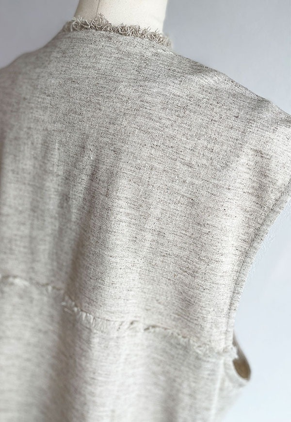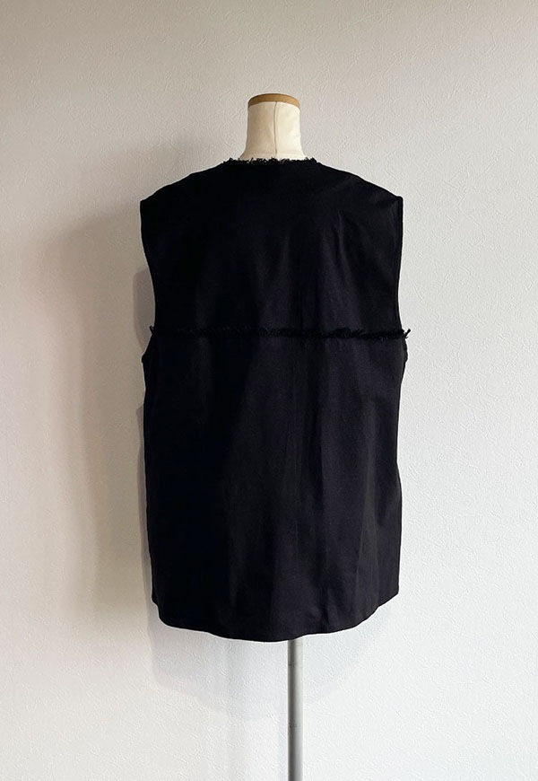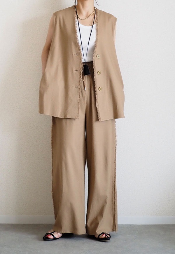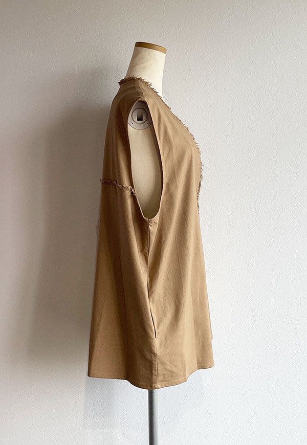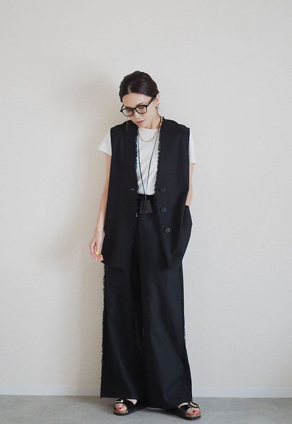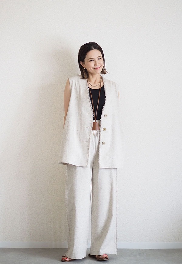 夏はキャミソールやタンクトップの上から秋口はカットソーなどとスタイリングしても◎アーム部分はゆったりとしたサイズ感でワンピースやAラインのシルエットの物にも対応可能です。カジュアルからキレイ目まで幅広いスタイリングを楽しめる万能ITEMです。同素材のパンツとの組み合わせがおすすめです。