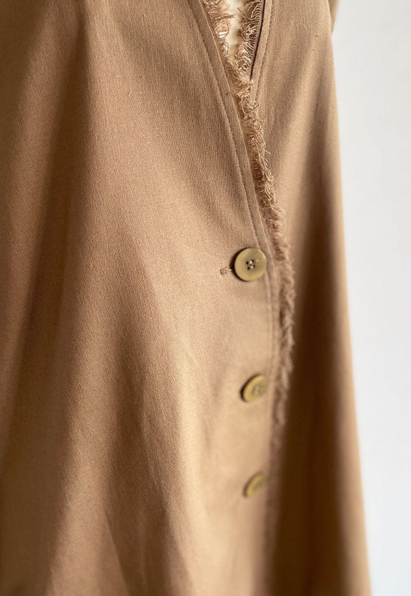前身頃の襟元と後ろセンターにもフリンジが施され大人なこなれ感を演出。