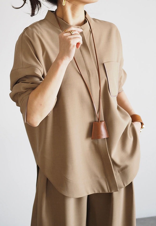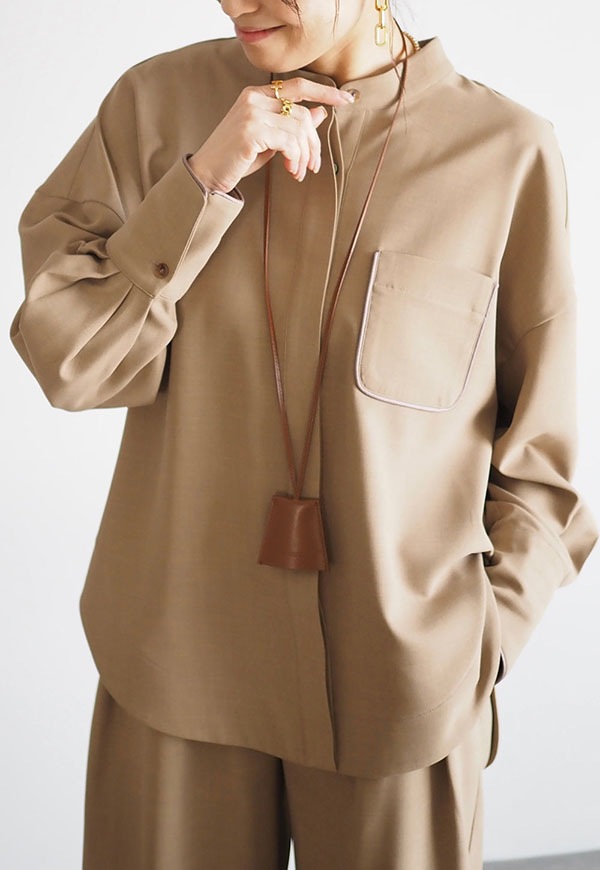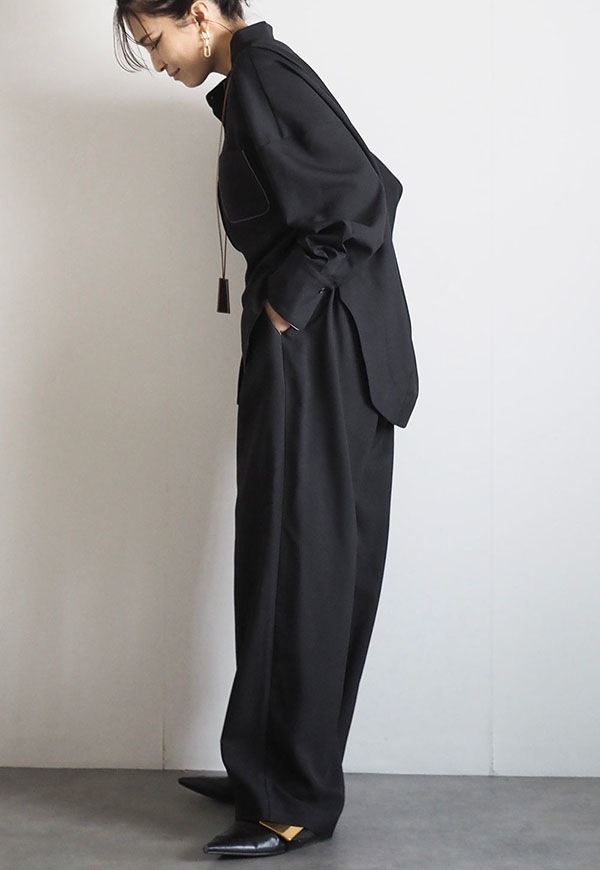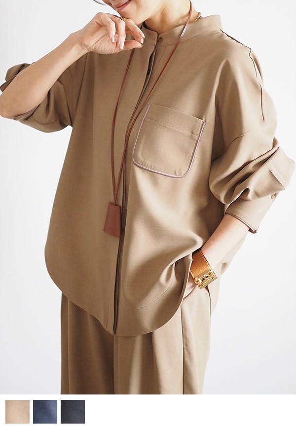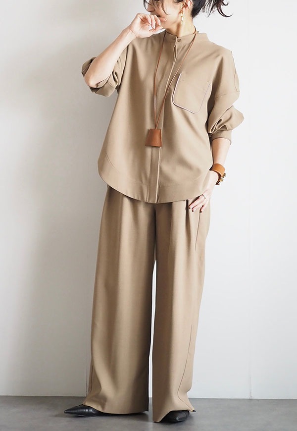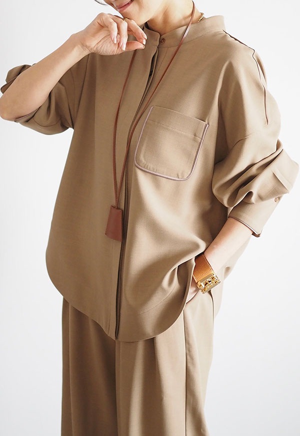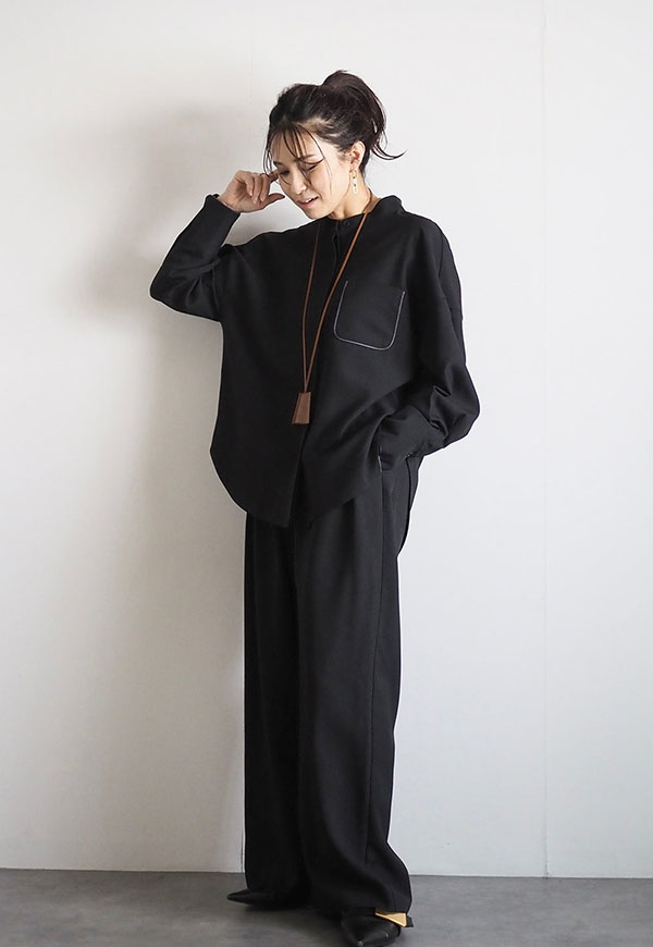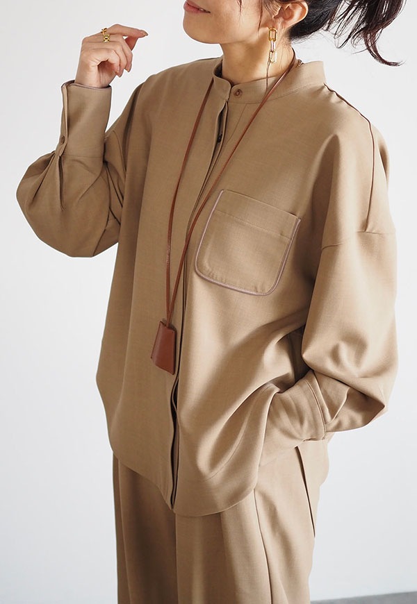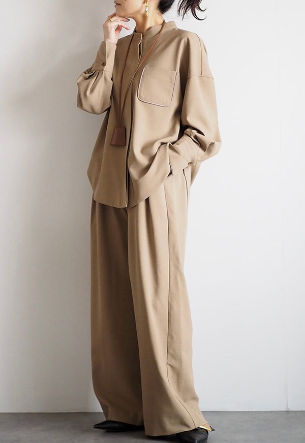 パイピングタックパンツと同生地のため、セットアップで着用いただくのもおすすめです。