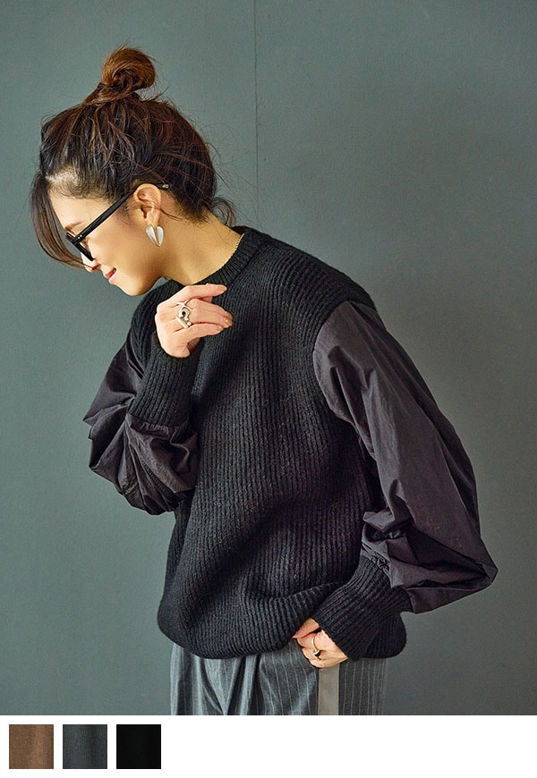 リブ編みの柔らかなニット素材と、ふんわりとしたナイロンの袖が印象的な一枚。