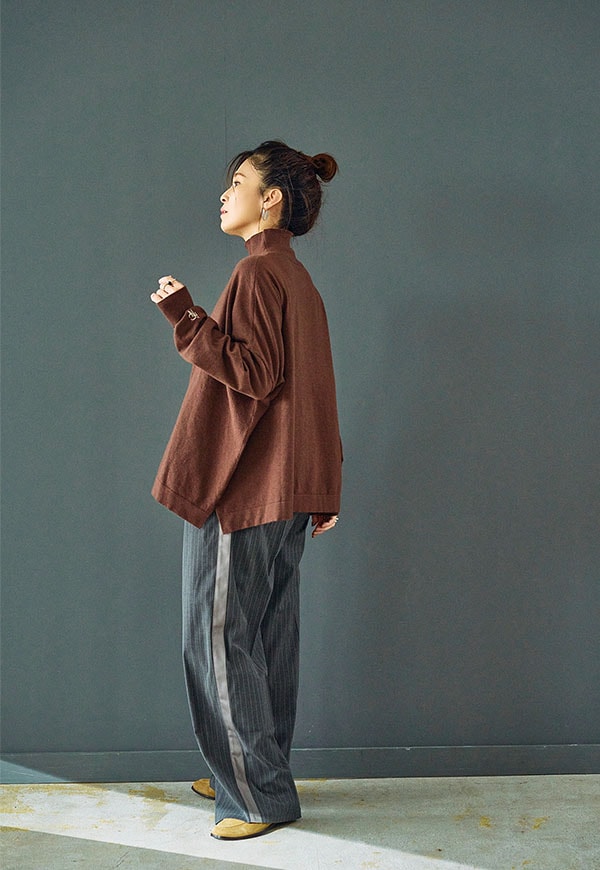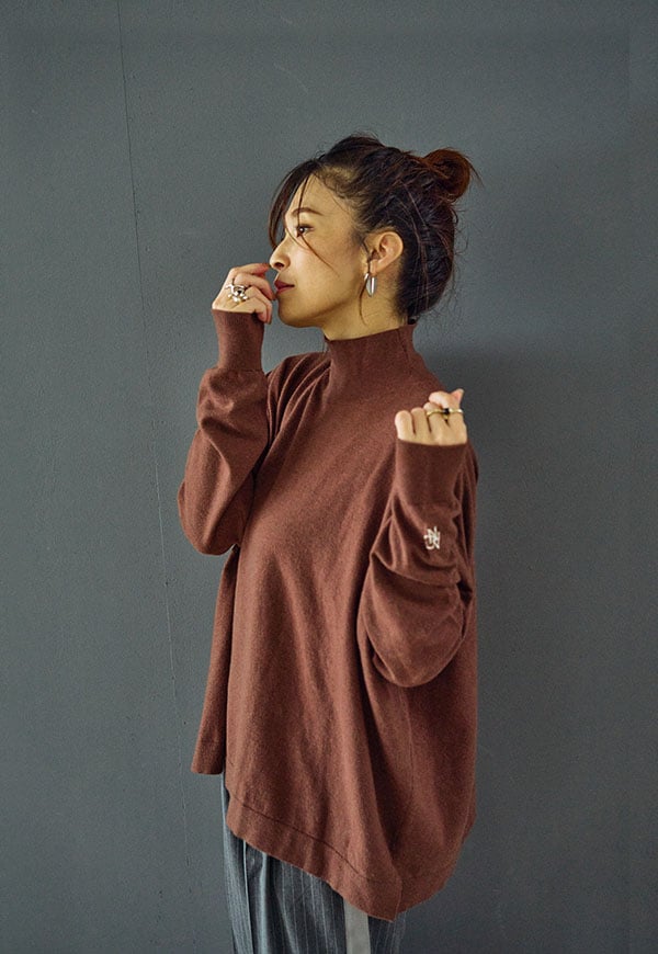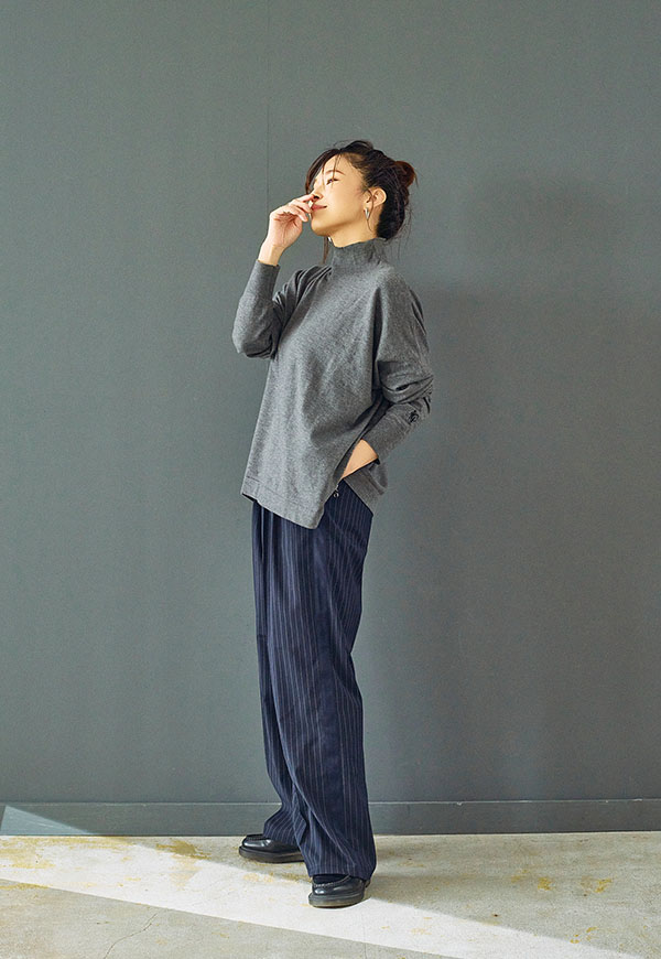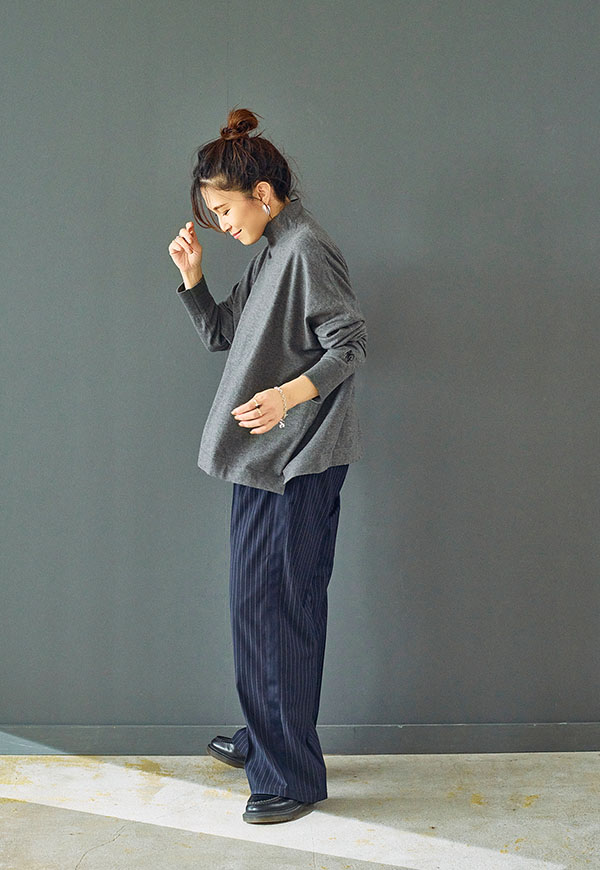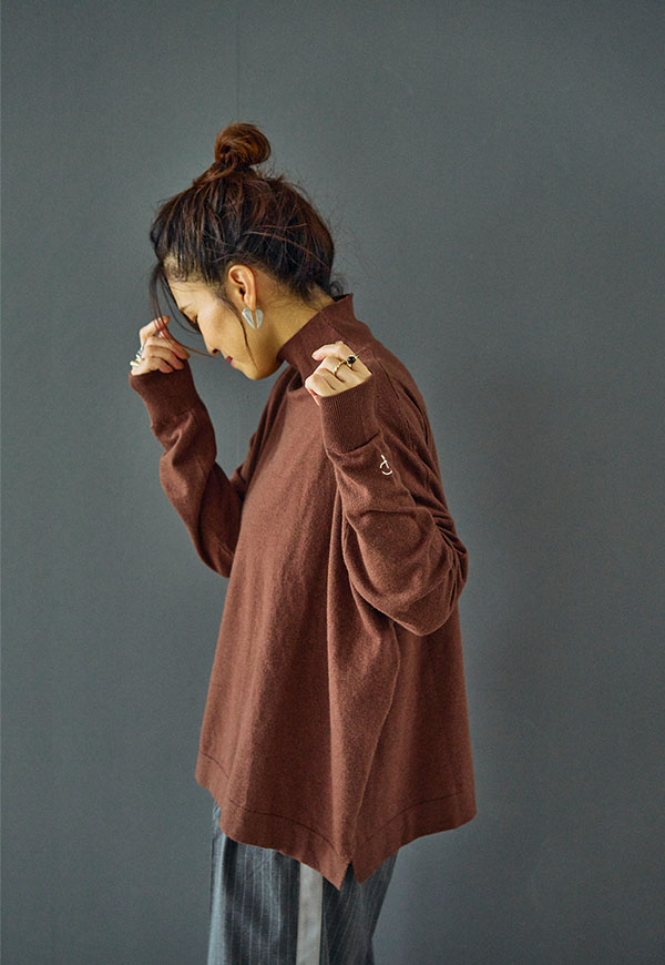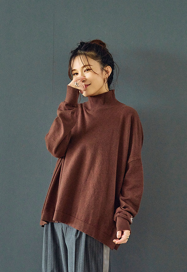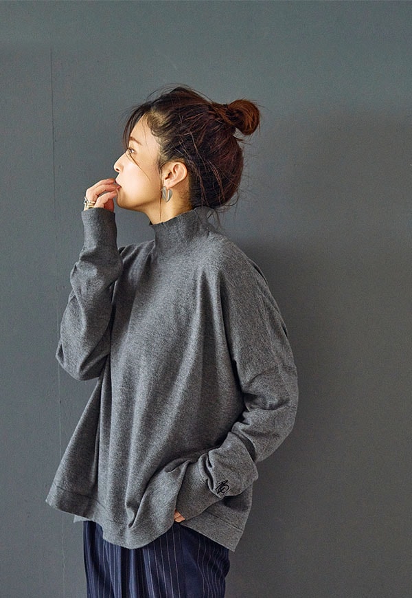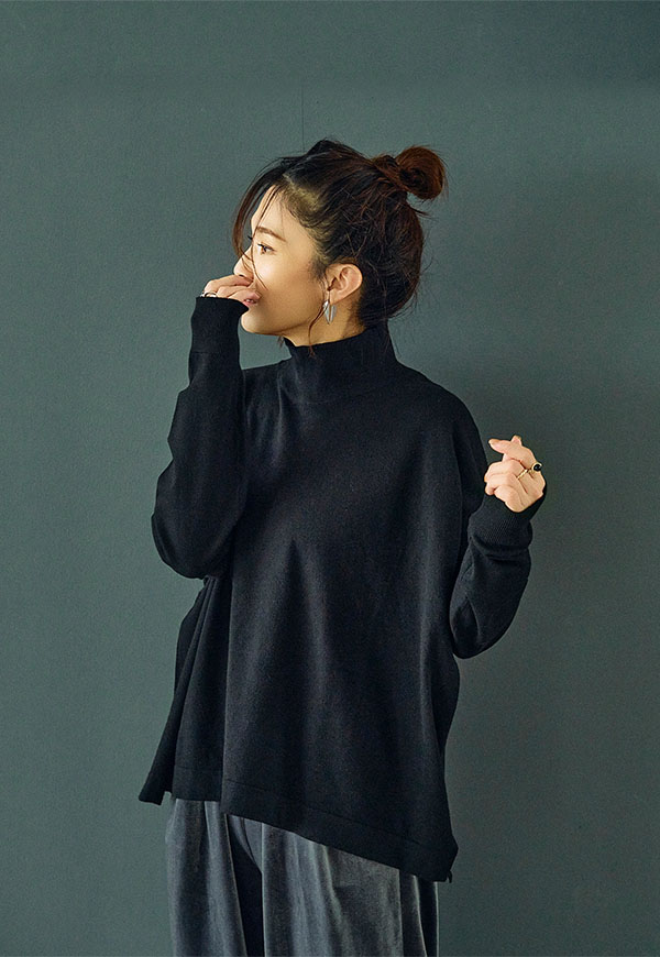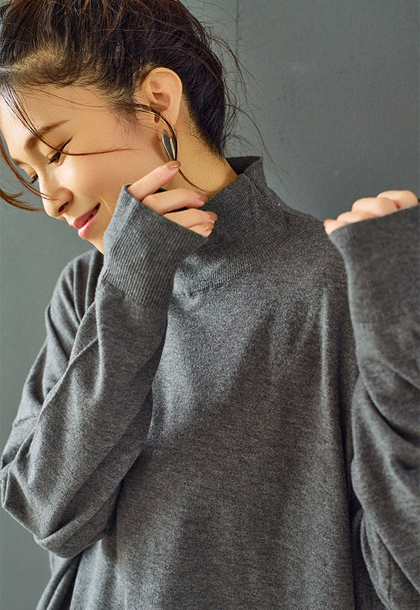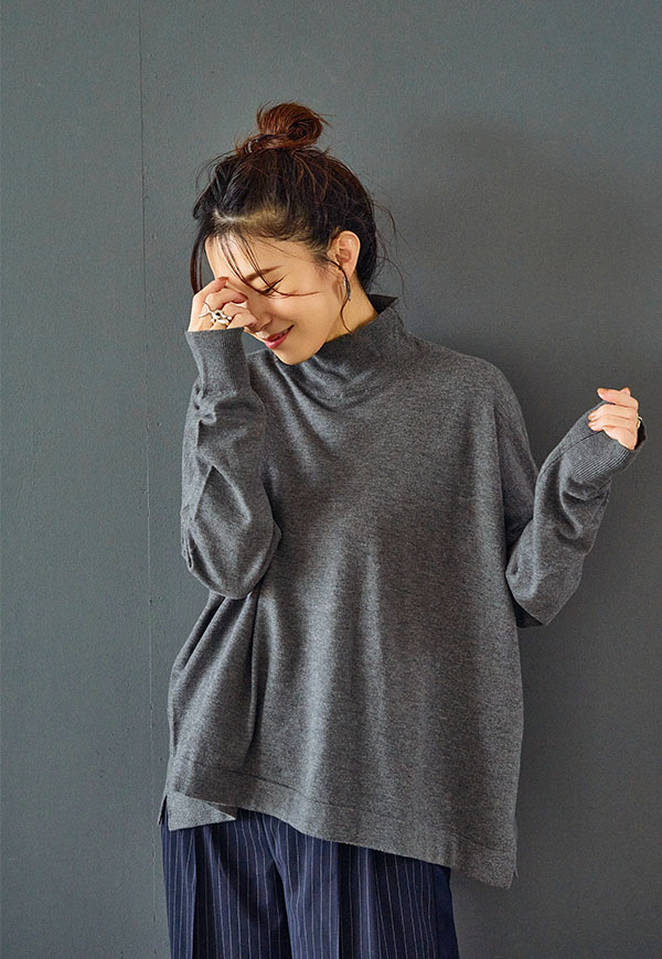 ゆとりをもたせたタートル部分は首元を優しく包み込みつつ締め付け感がなく、折り返してもそのままでもサマになるデザインです。