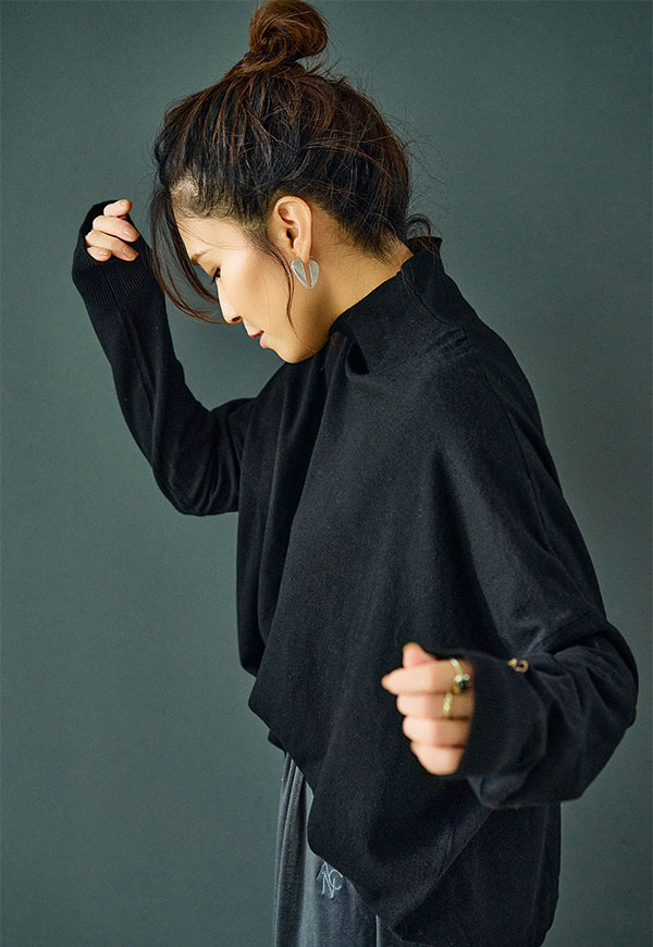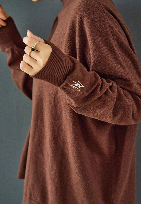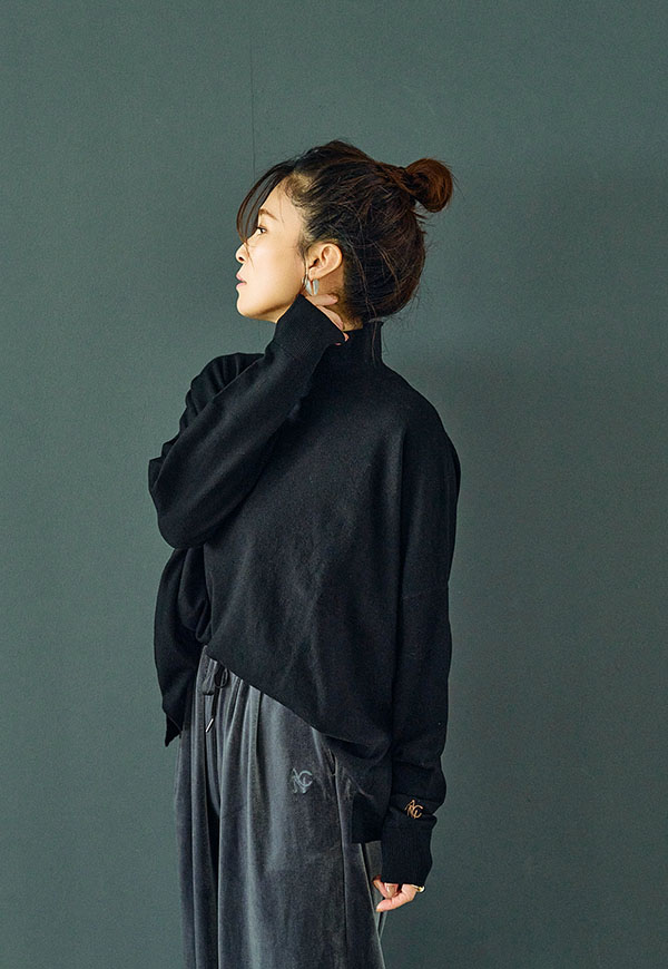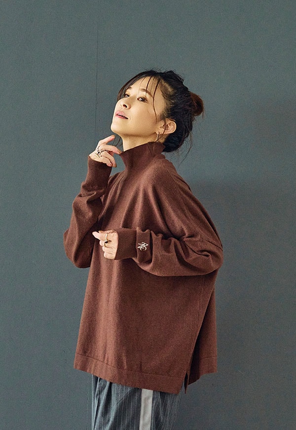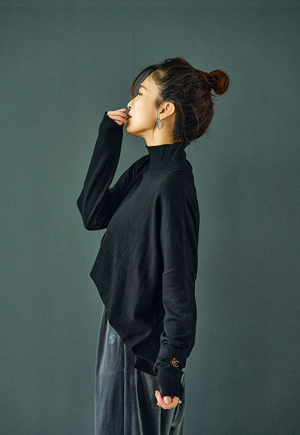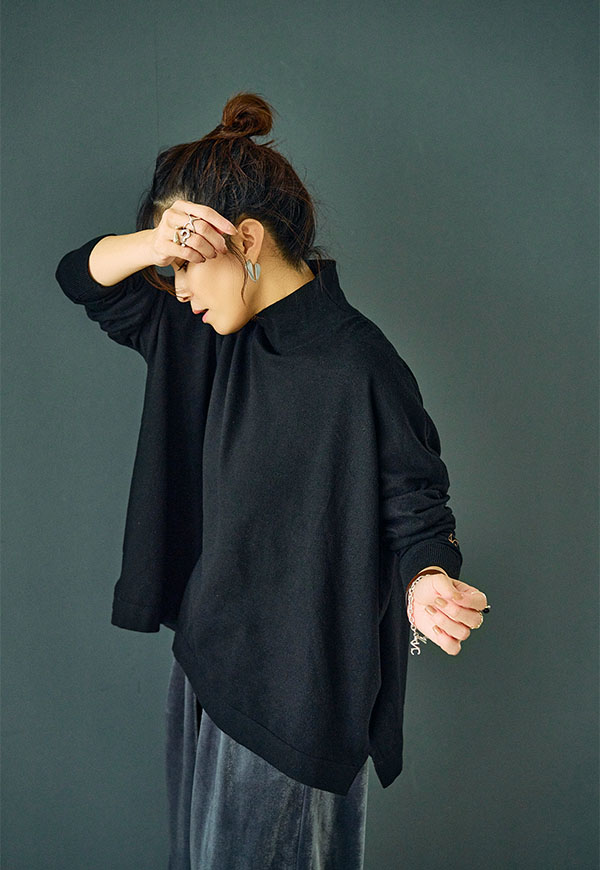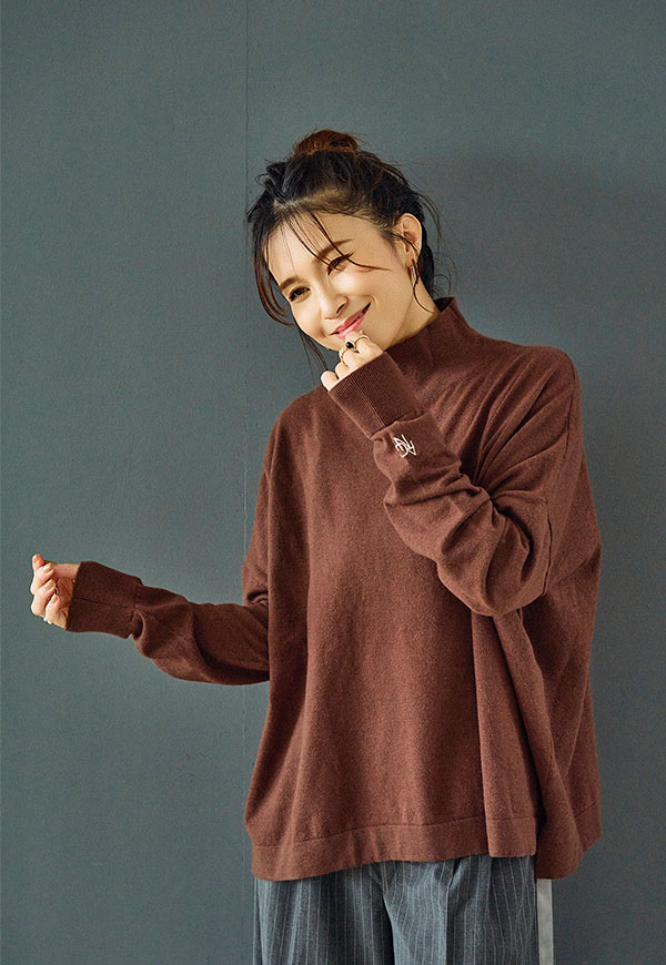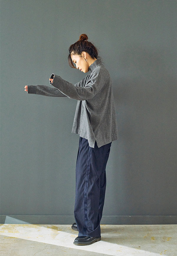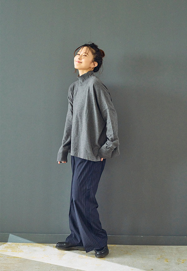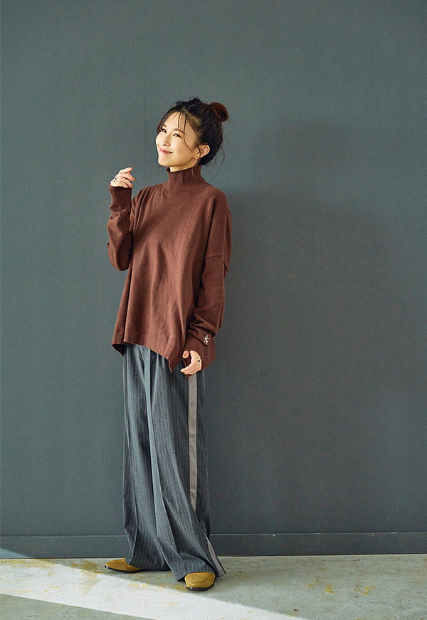 ゆとりをもたせたタートル部分は首元を優しく包み込みつつ締め付け感がなく、折り返してもそのままでもサマになるデザインです。