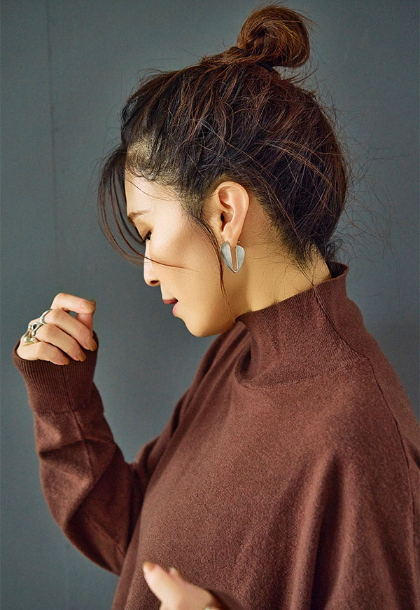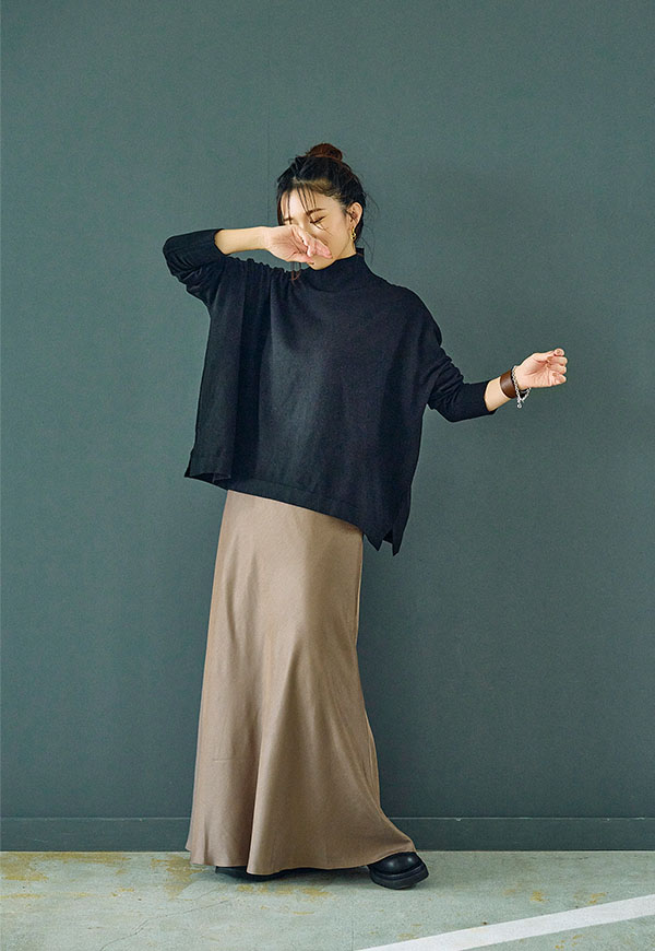 また、裾をインせずにアウトで着れば、ニットのオーバーサイズシルエットがそのまま活かされ、バイアスフレアスカートやすっきりとしたストレートスカートと組み合わせることで女性らしいラインを楽しむこともできます。