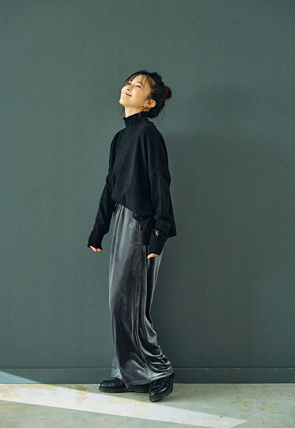 ゆったりとしたボリュームが魅力のワイドパンツやベロアパンツと合わせれば、トップスの落ち感とボトムスのボリュームが調和した、リラックス感のある大人スタイルが完成します。