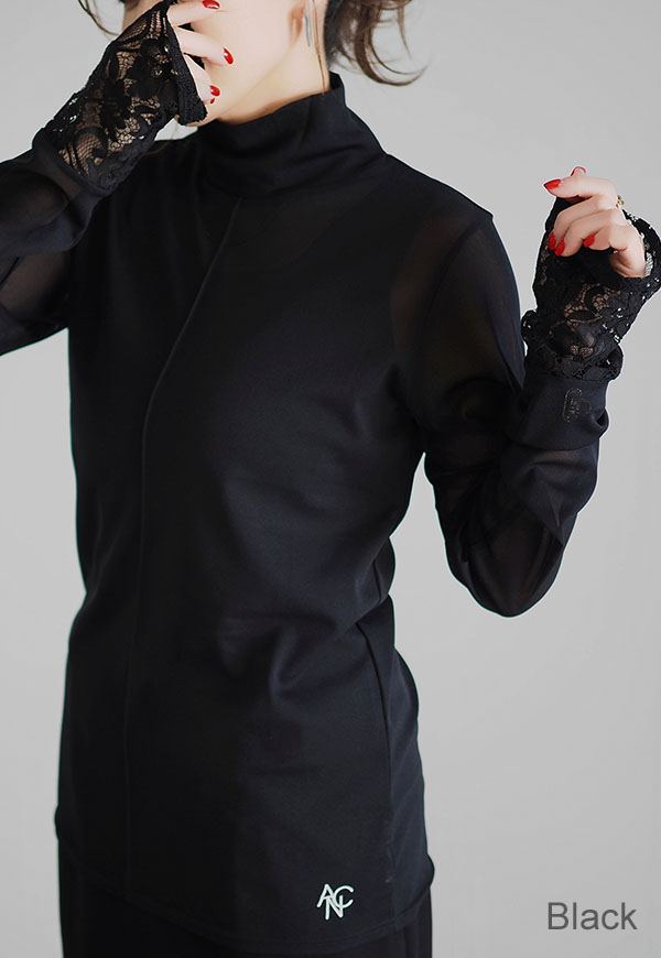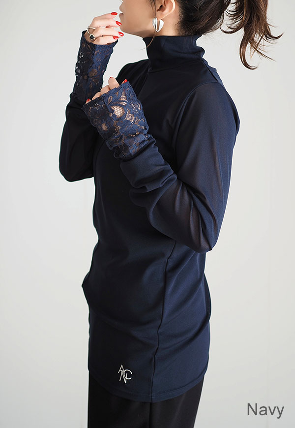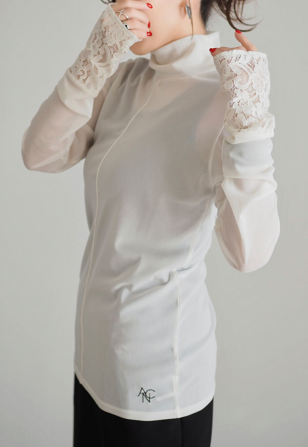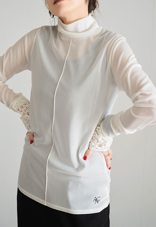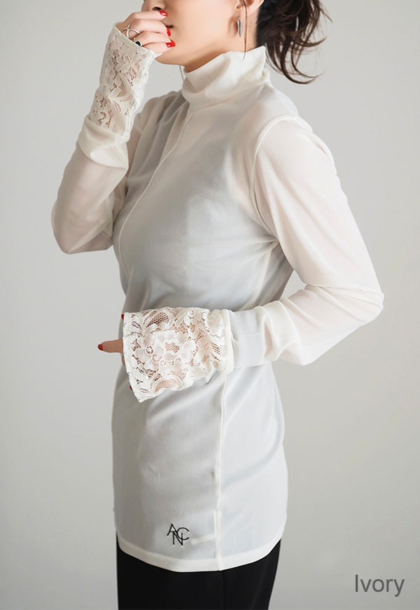 柔らかい日本製のシアー素材に、袖口にレースを施したタートルネックトップスになります。