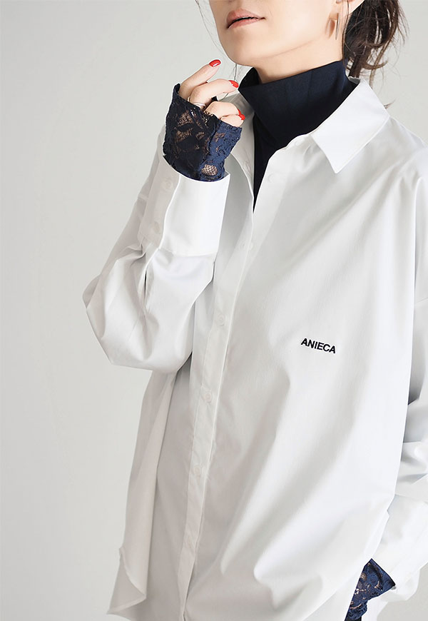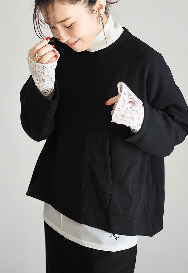 長めの袖丈の端にレースを切り替えることでアウターとの重ね着の際にポイントになる、コーディネートに合わせて何枚も欲しくなるようなアイテムです。