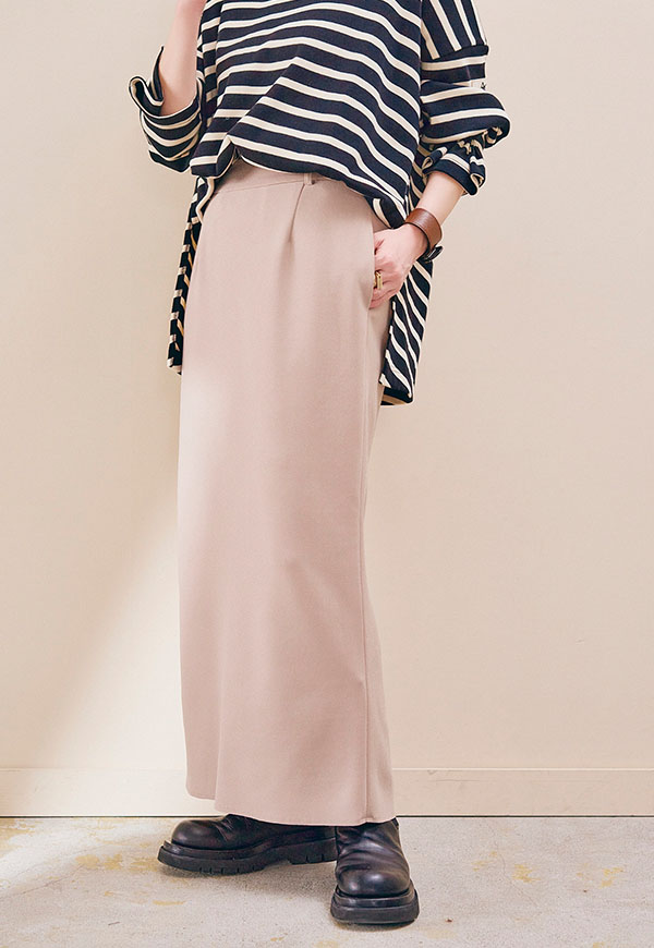 どんなトップスとも相性が良く、合わせるアイテムを選ばない万能ロングスカートです。