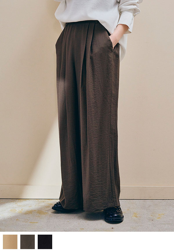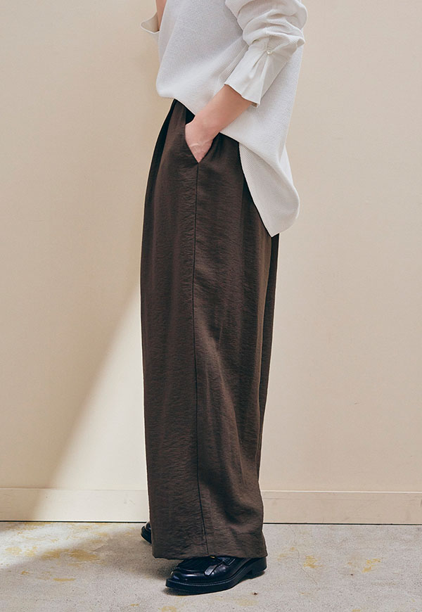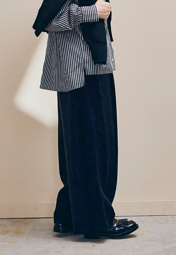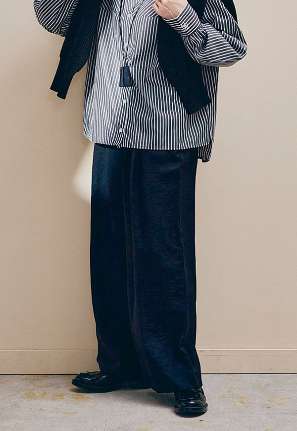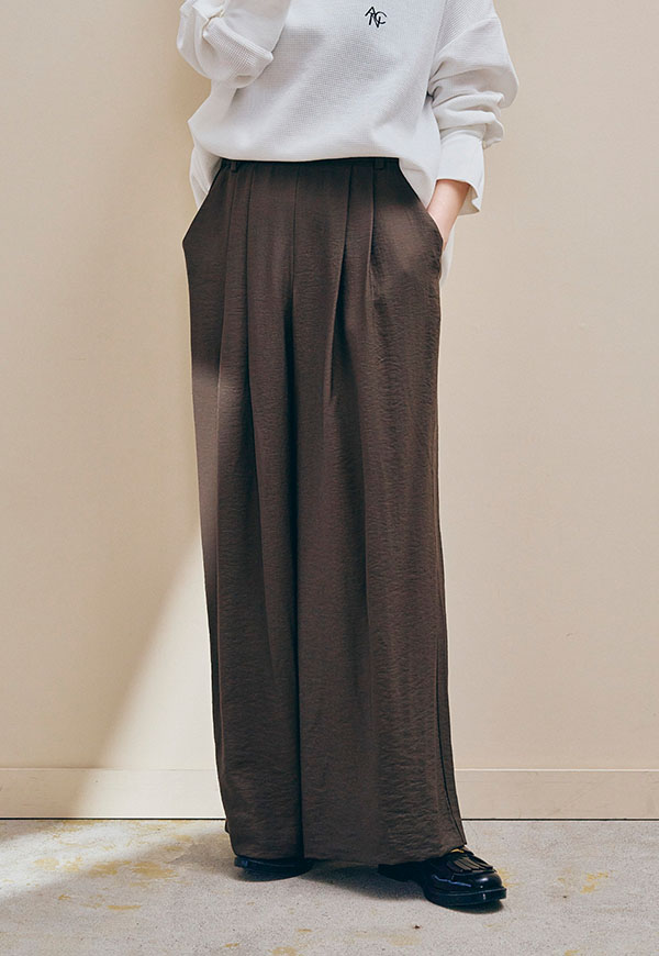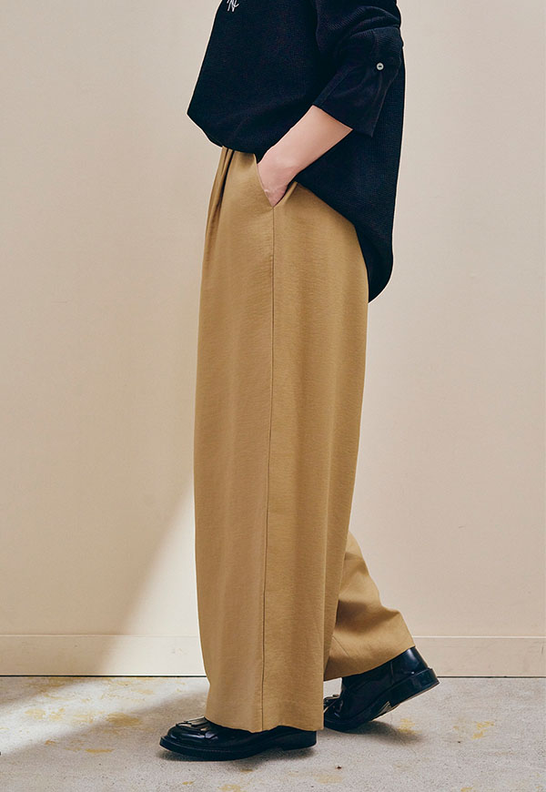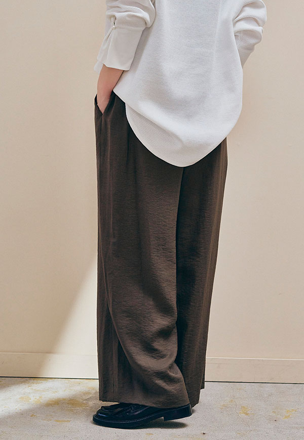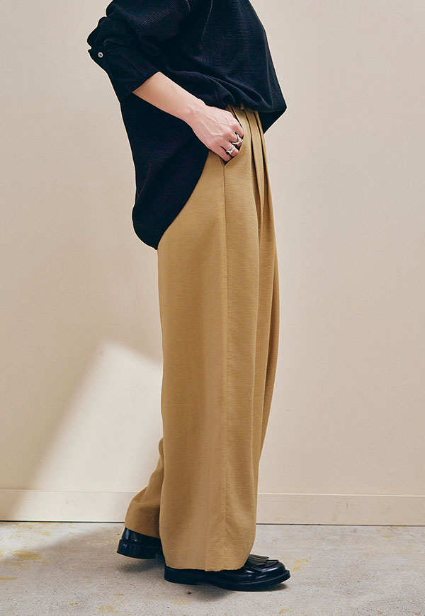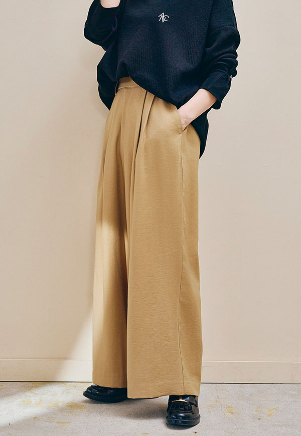 さっと穿けてストレスフリーでありながら、フロントには2タックを入れることで、腰まわりを自然にカバーし、きれいな縦ラインを演出します。