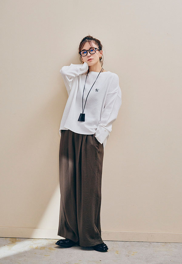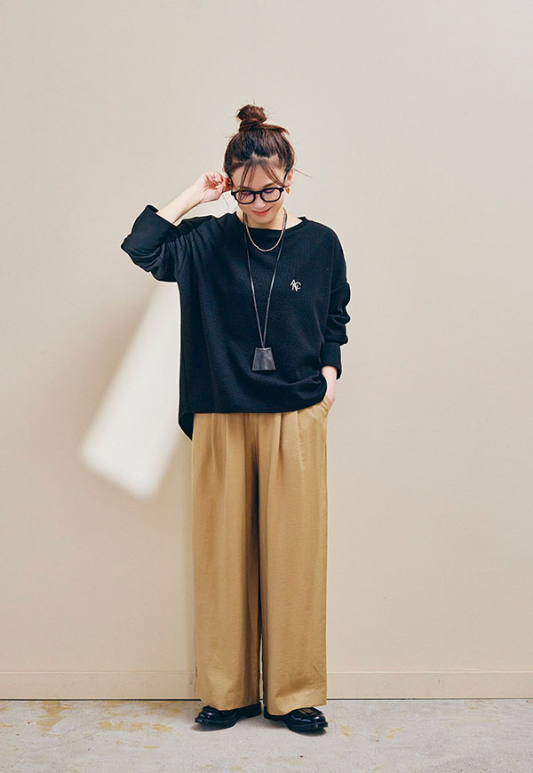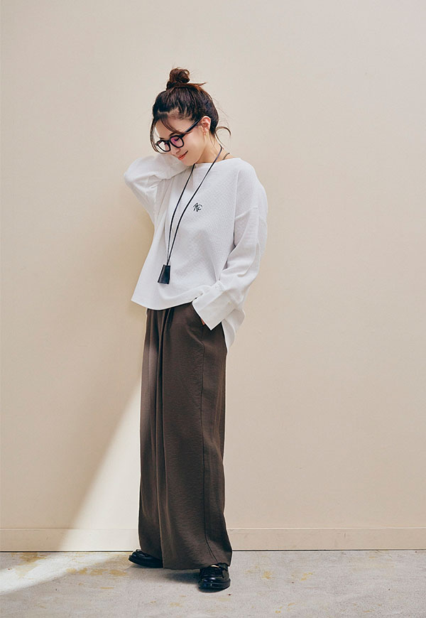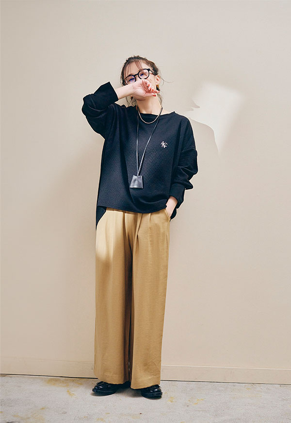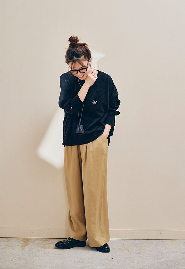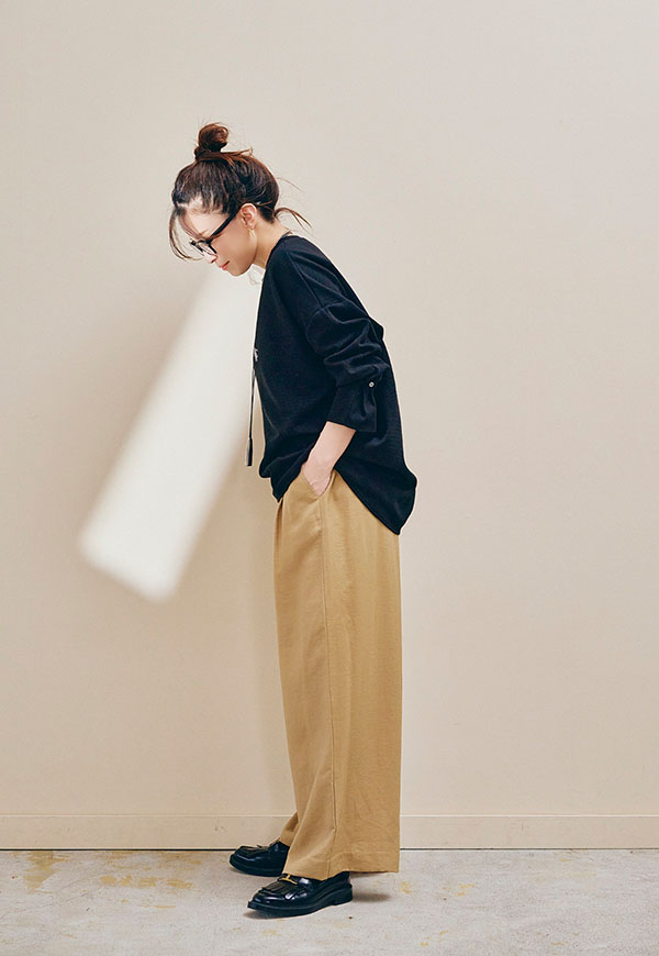 足元はスニーカーやサンダル、ブーツまで相性が良く、シーズンを通して着回し力の高い万能パンツです。