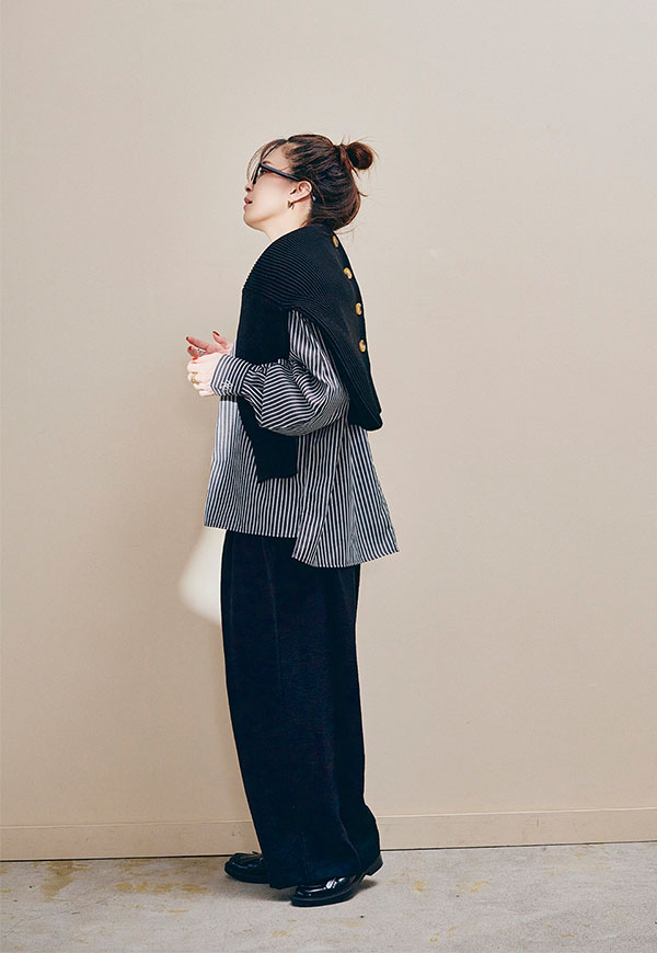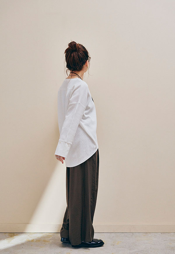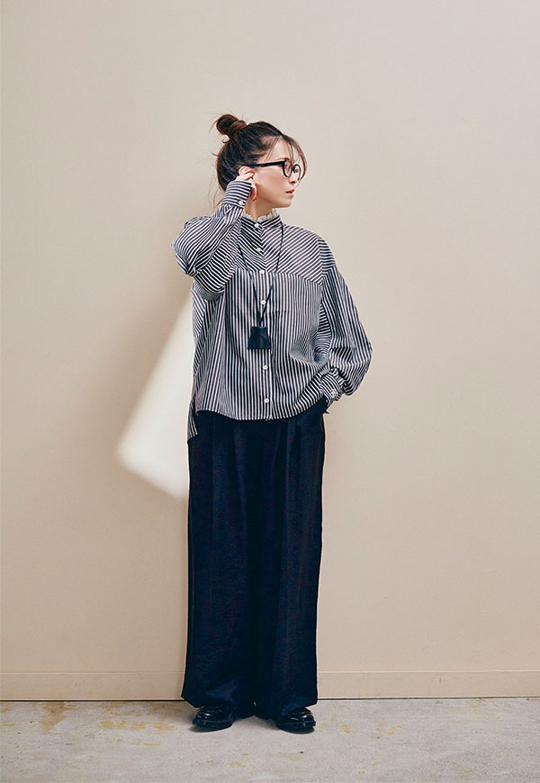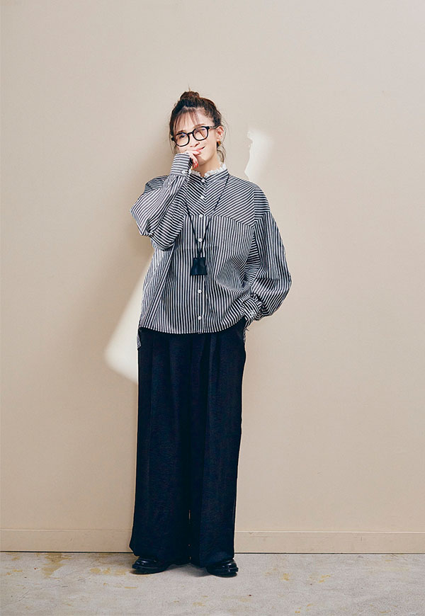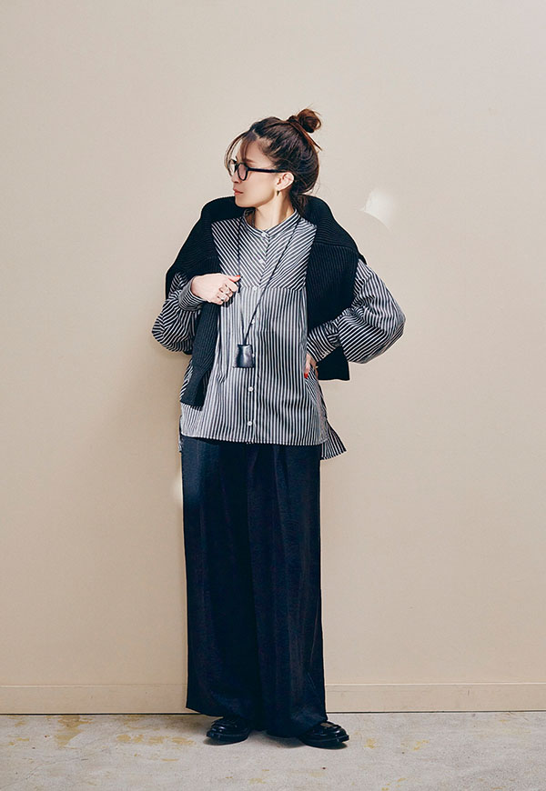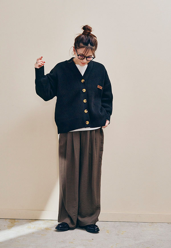 足元はスニーカーやサンダル、ブーツまで相性が良く、シーズンを通して着回し力の高い万能パンツです。