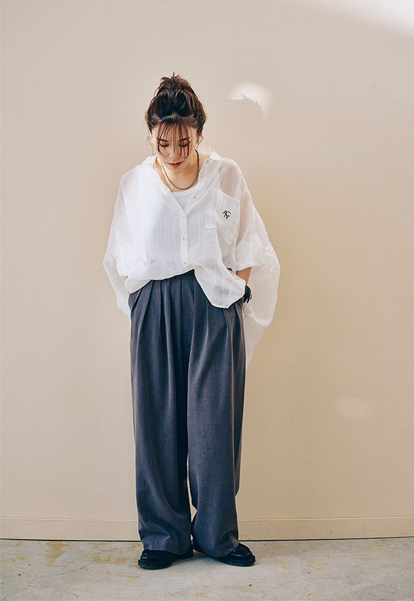 ゆるめトップスと合わせるときは、袖まくりやアクセサリーで抜け感をプラスすると◎。