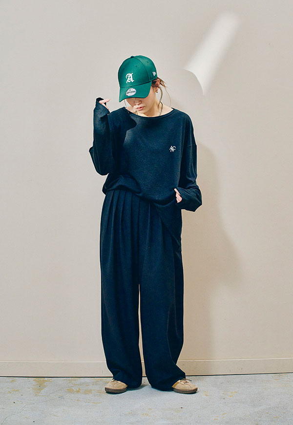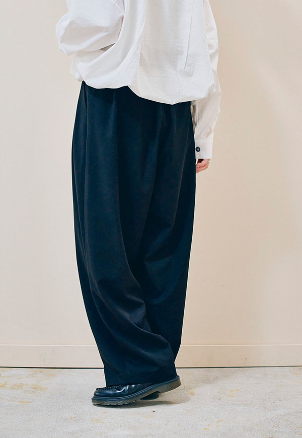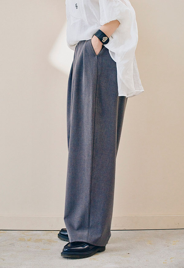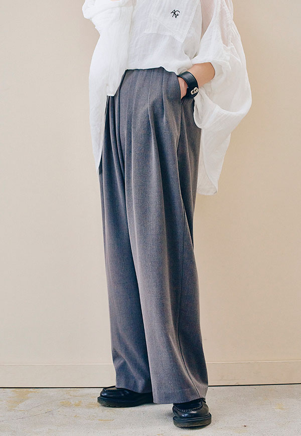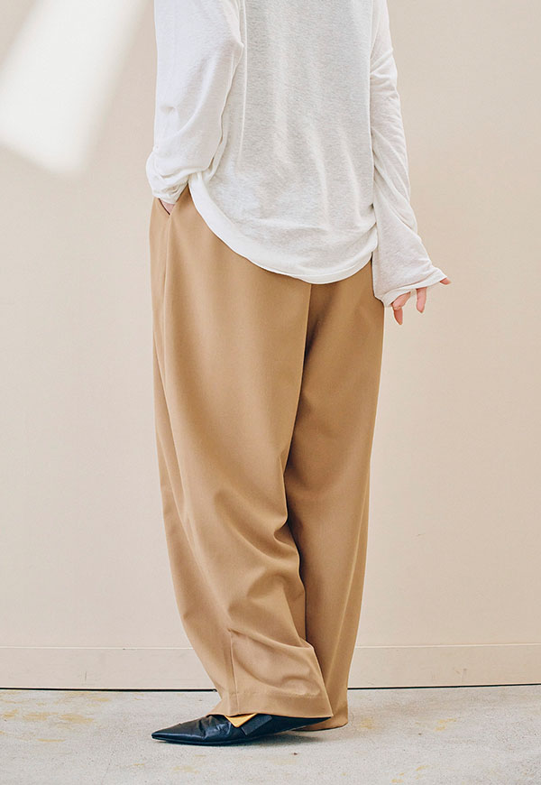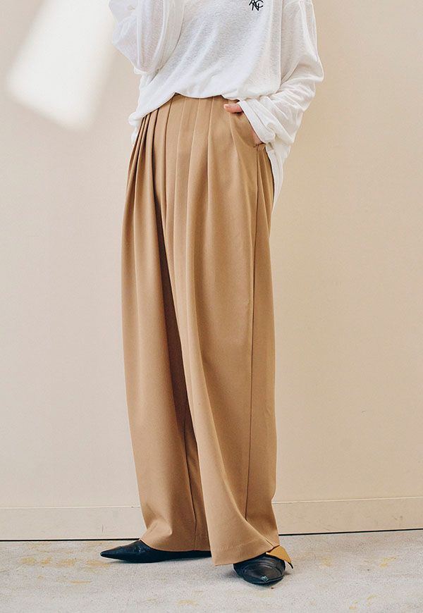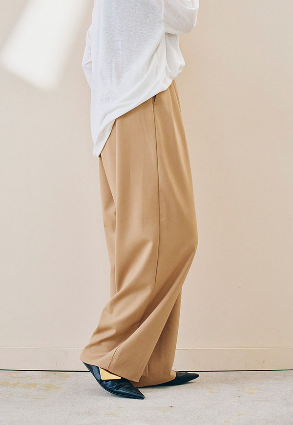 フロントに深めの3タックを施した、ANIECAらしい立体感のあるワイドシルエット。腰まわりに自然なゆとりが生まれ、気になるラインを拾わずにすっきり見せてくれます。