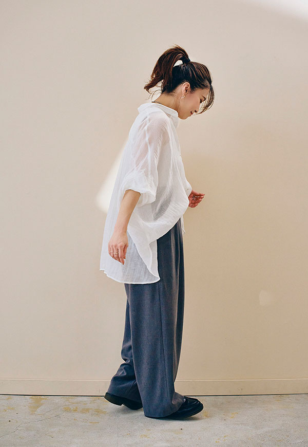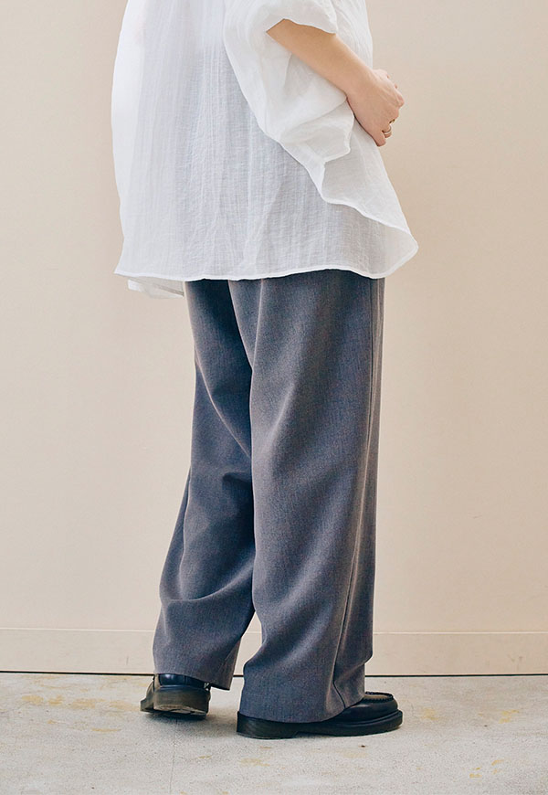 ポリエステル×レーヨンの落ち感のある素材が、動くたびにきれいなドレープを描きます。ほんのりストレッチも効いているので、長時間の着用も快適。