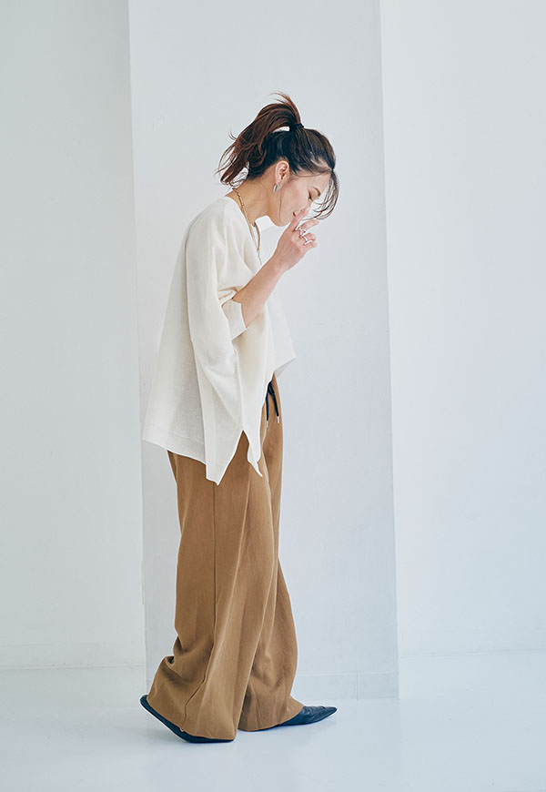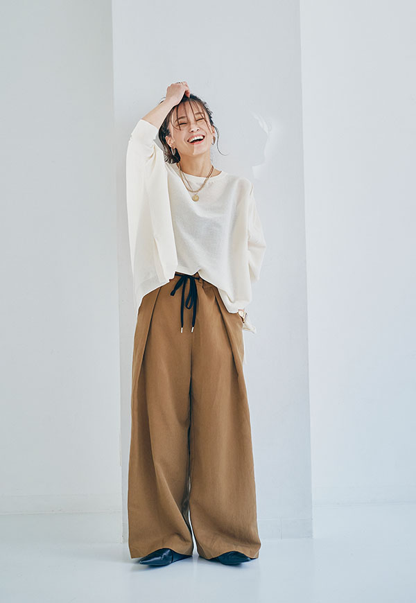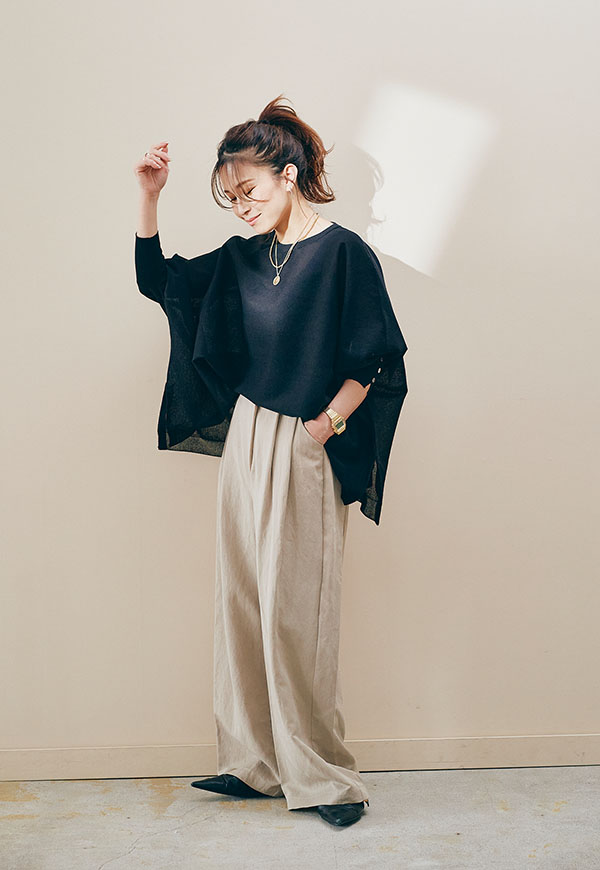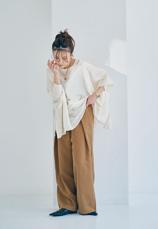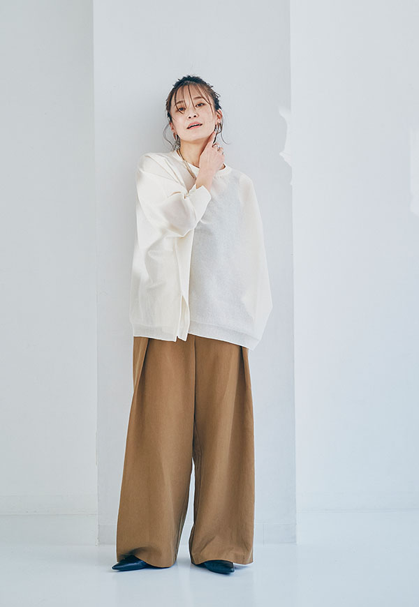 ワイドパンツやテーパードパンツと合わせて、リラックス感のある着こなしがおすすめです。