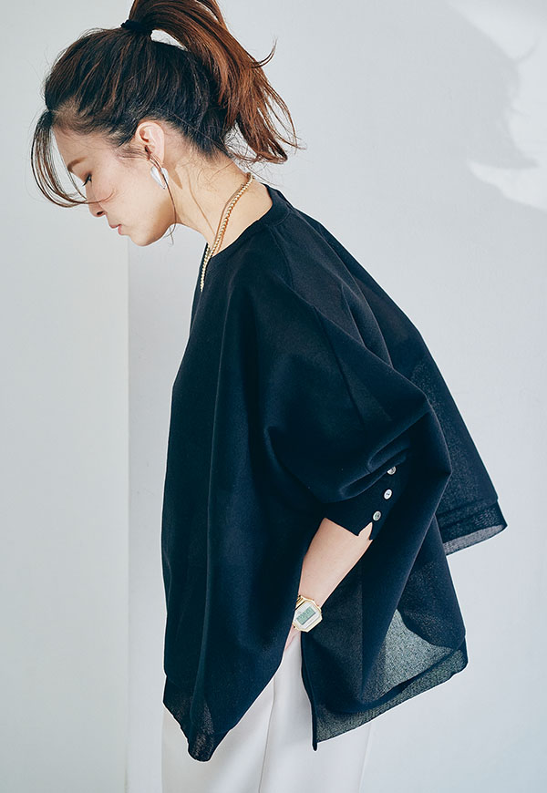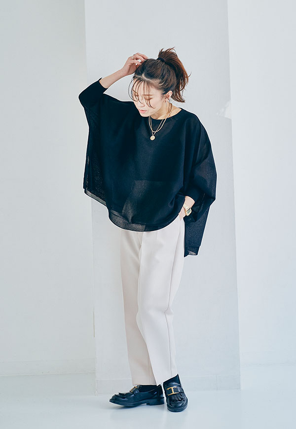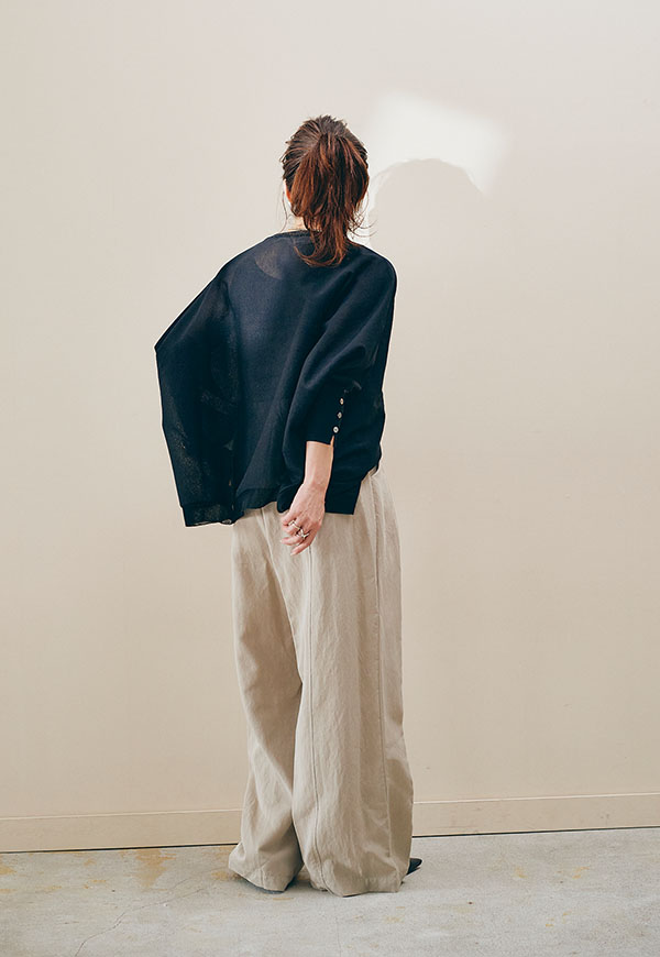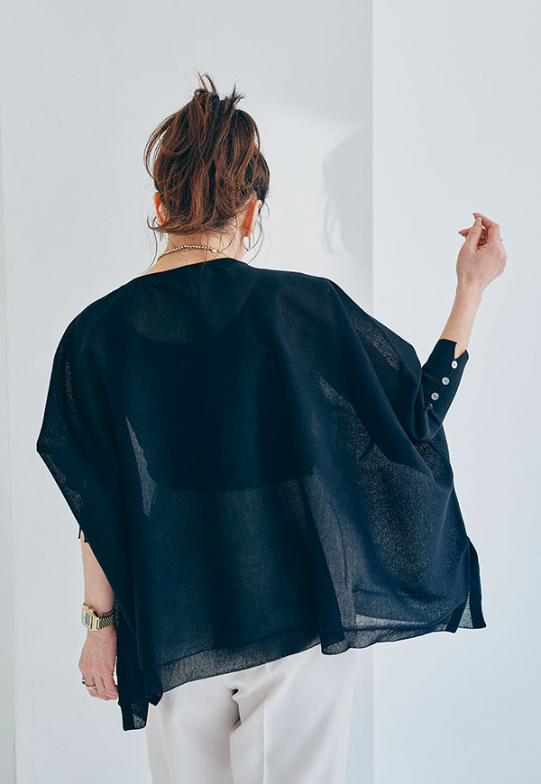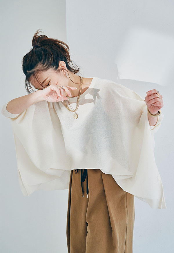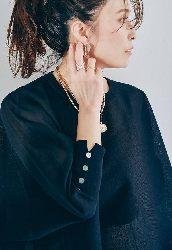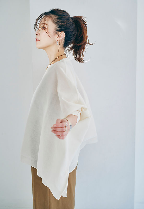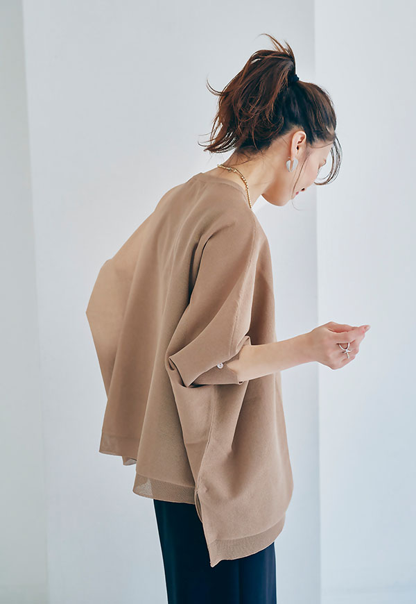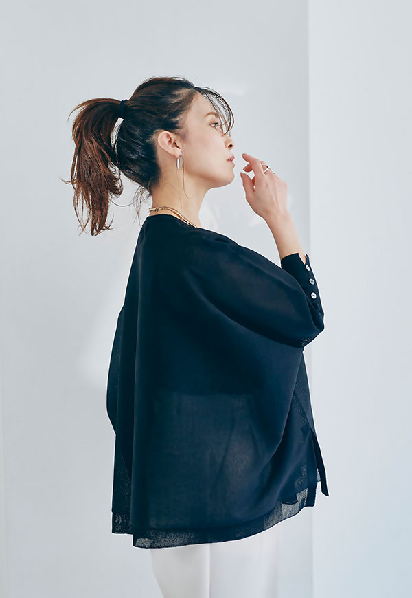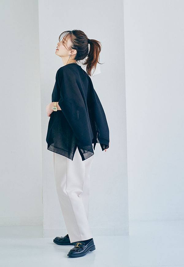 軽やかな素材感なので、春から初夏にかけて快適に着用でき、インナー次第で透け感を楽しむスタイリングも◎