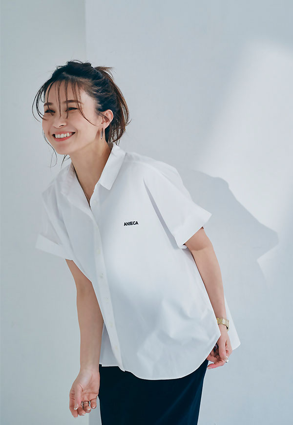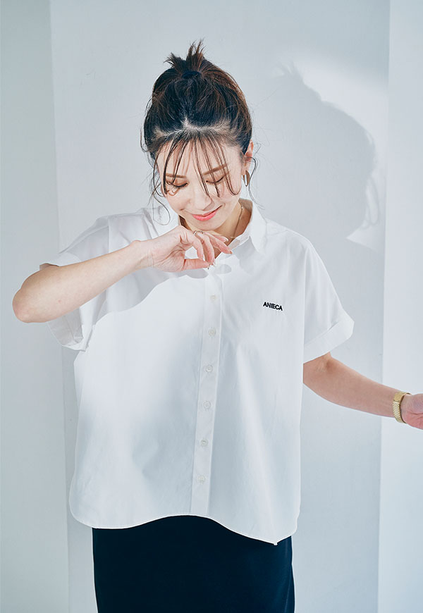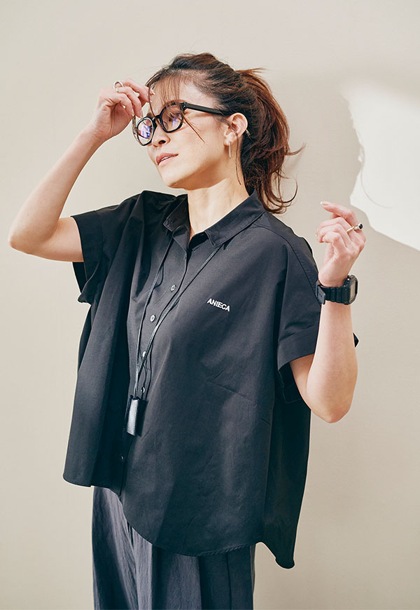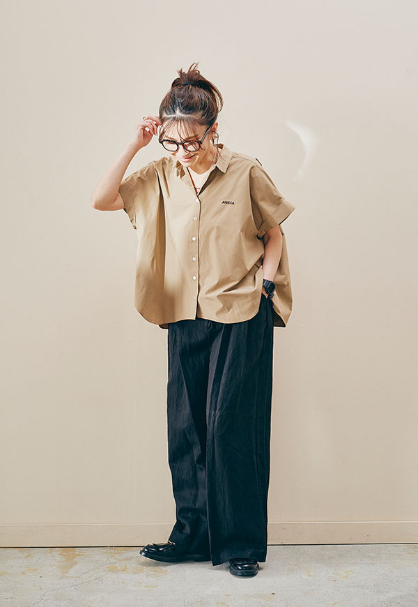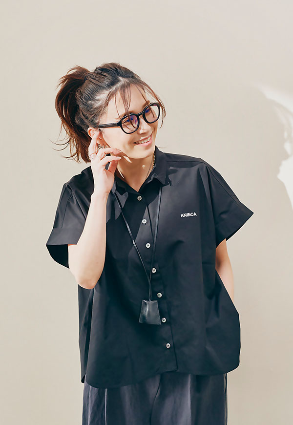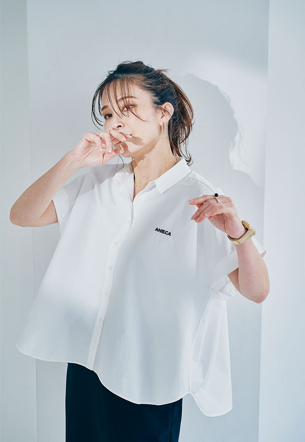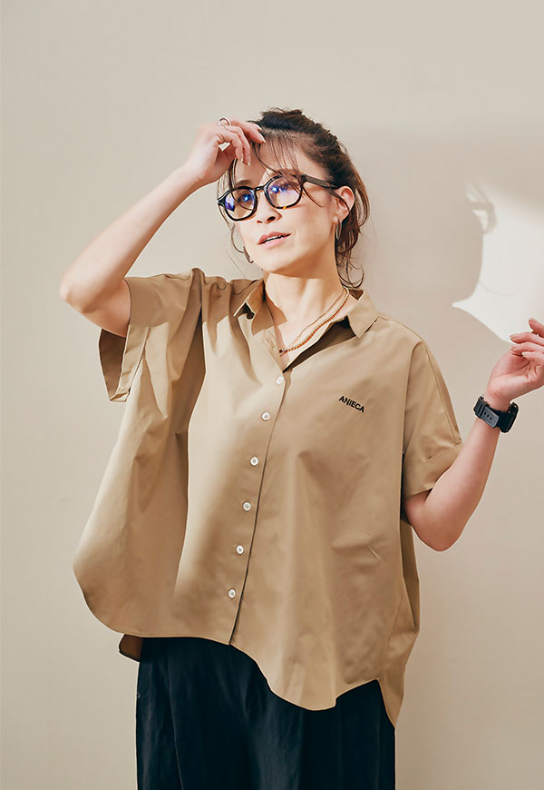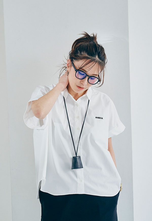 左胸にはANIECAロゴを刺繍で施し、シンプルな中にさりげないアクセントを加えています。