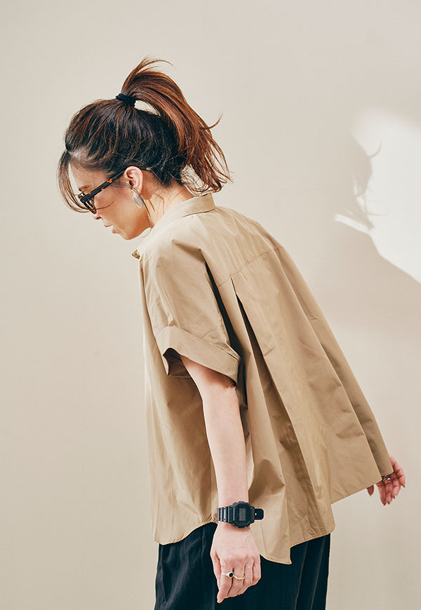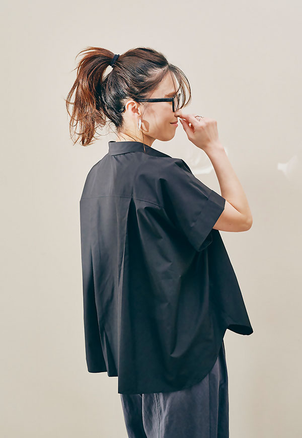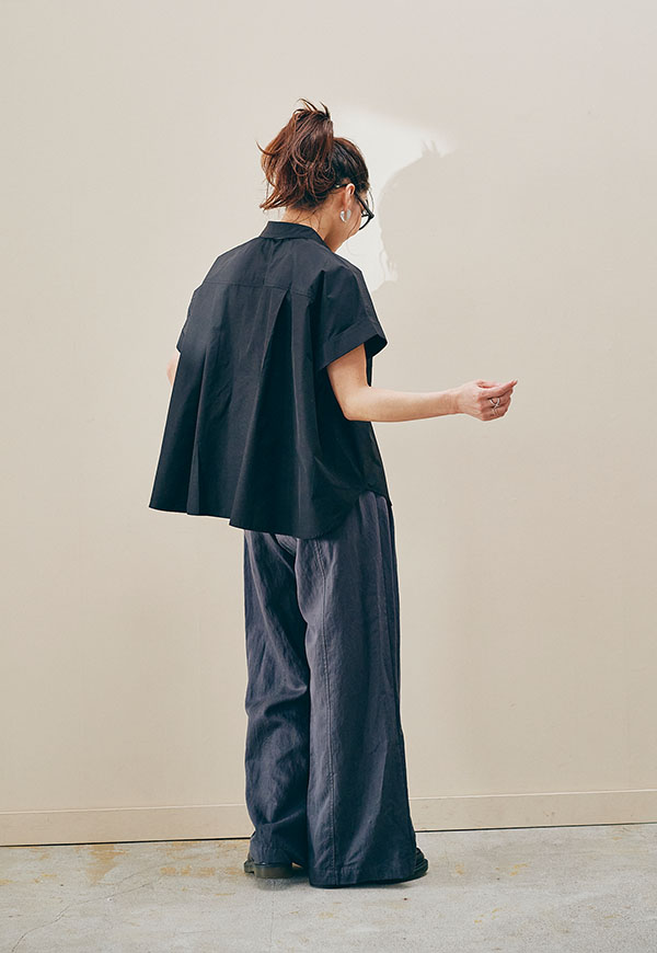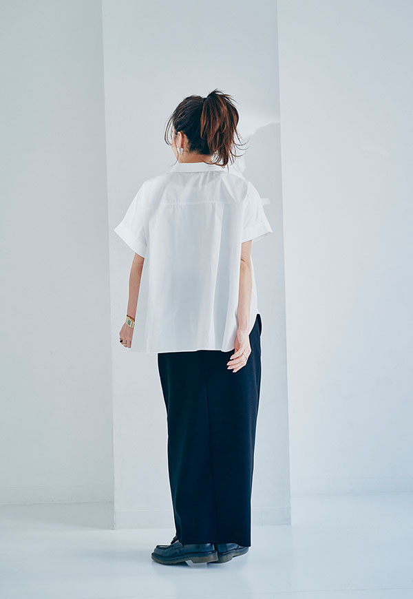 後ろ身頃にゆとりを持たせたパターン設計により、着用した際に自然な立体感が生まれ、動きのあるシルエットを演出。
