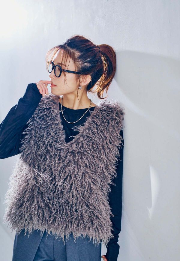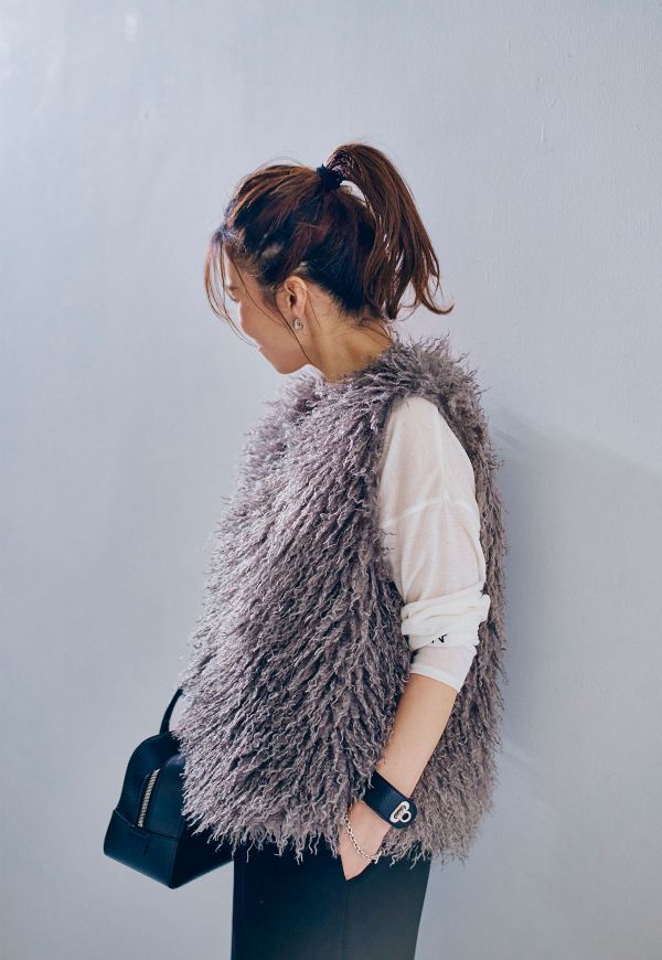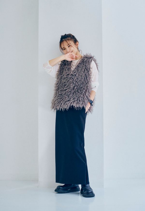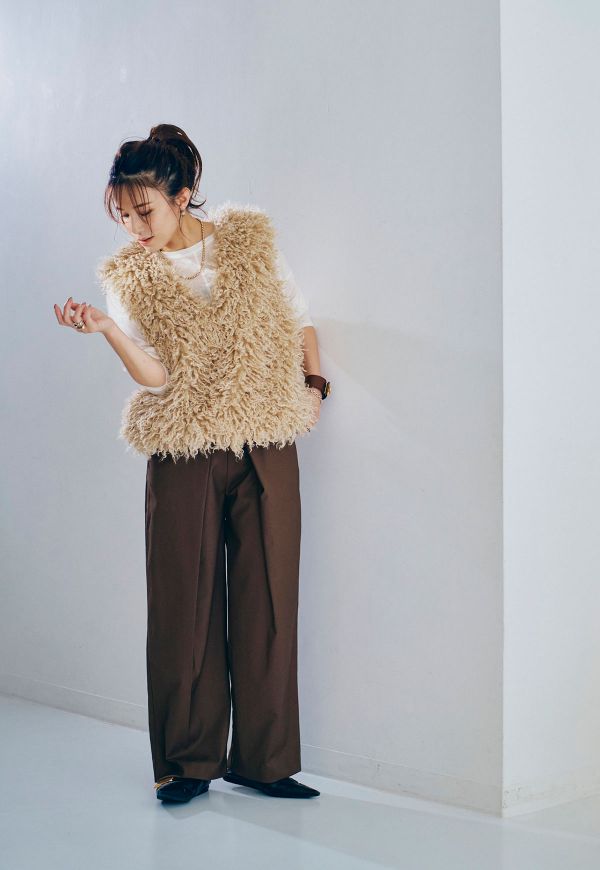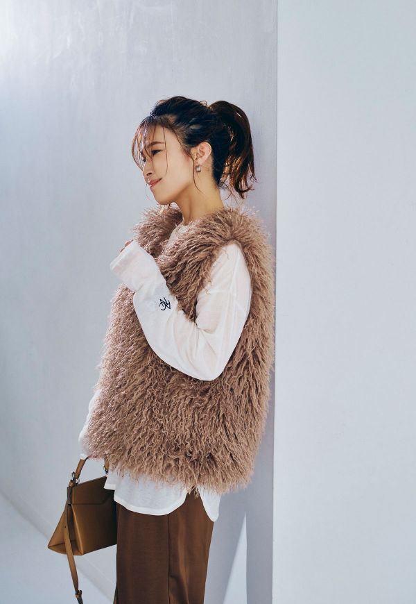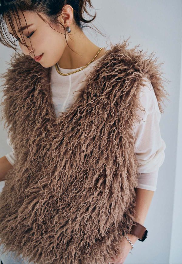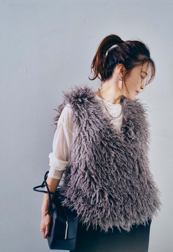 インパクトのある素材感のカーリーファーを活かした、素材感の異なるアクセント強めなスタイリングがおススメです。存在感のある素材は、合わせるボトムスの素材を選ばず、どんな素材にも合わせやすいです。