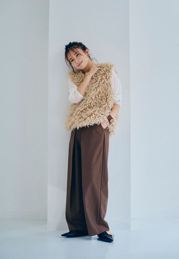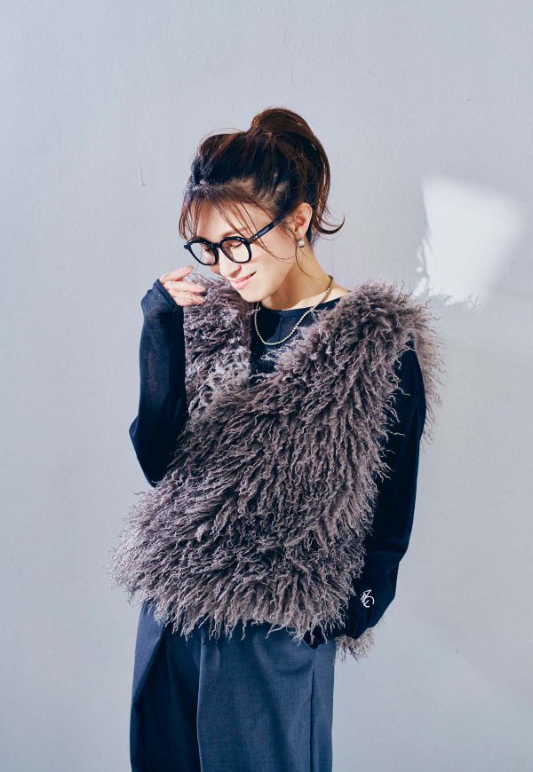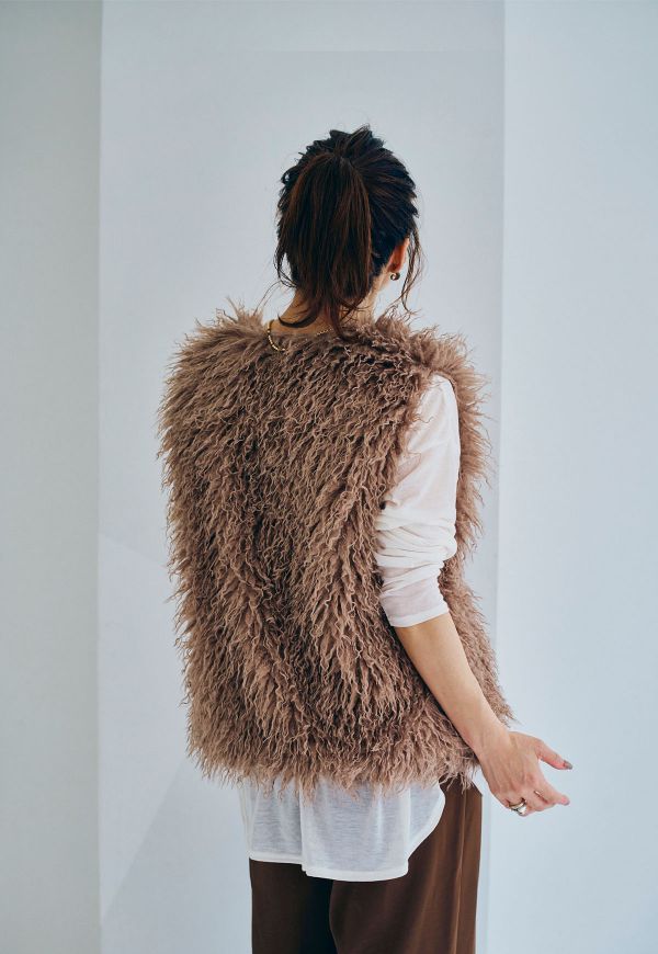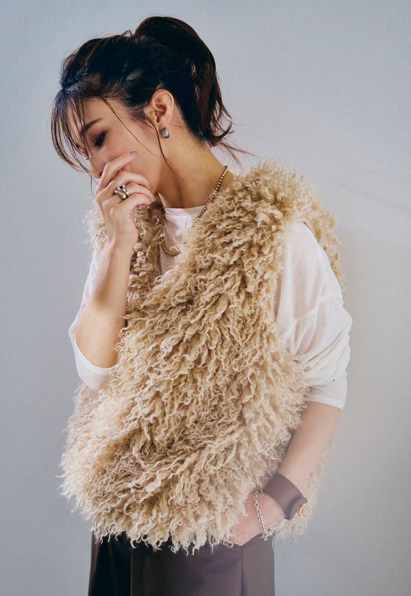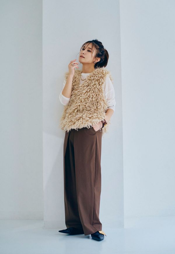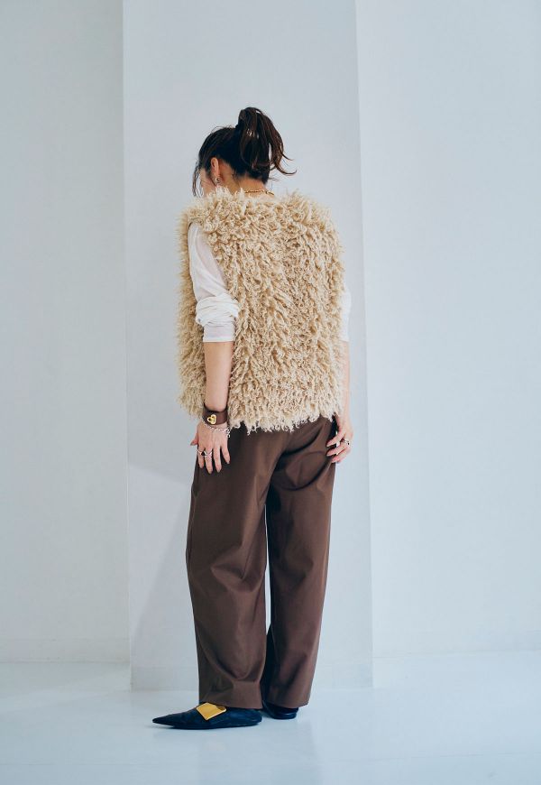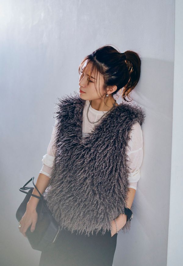 インパクトのある素材感のカーリーファーを活かした、素材感の異なるアクセント強めなスタイリングがおススメです。存在感のある素材は、合わせるボトムスの素材を選ばず、どんな素材にも合わせやすいです。