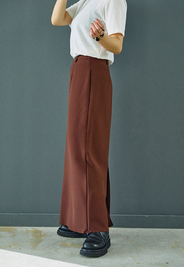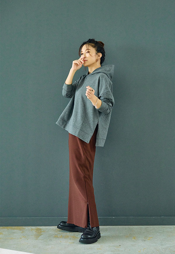 スニーカーやブーツと合わせたモードな着こなしや、ヒールと合わせて上品にまとめるなど、一枚で様々な雰囲気を楽しめる万能アイテムです。