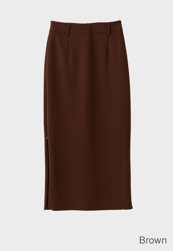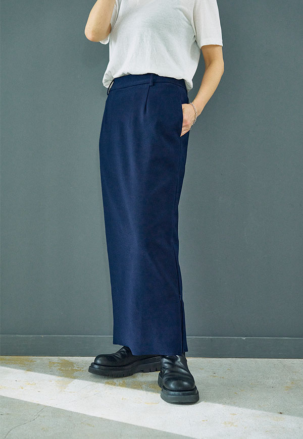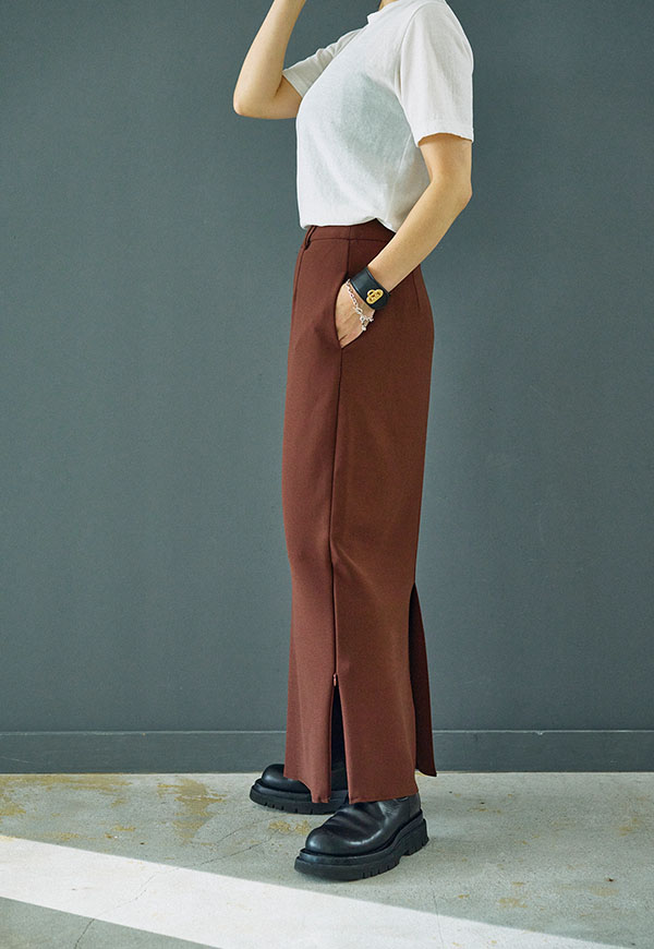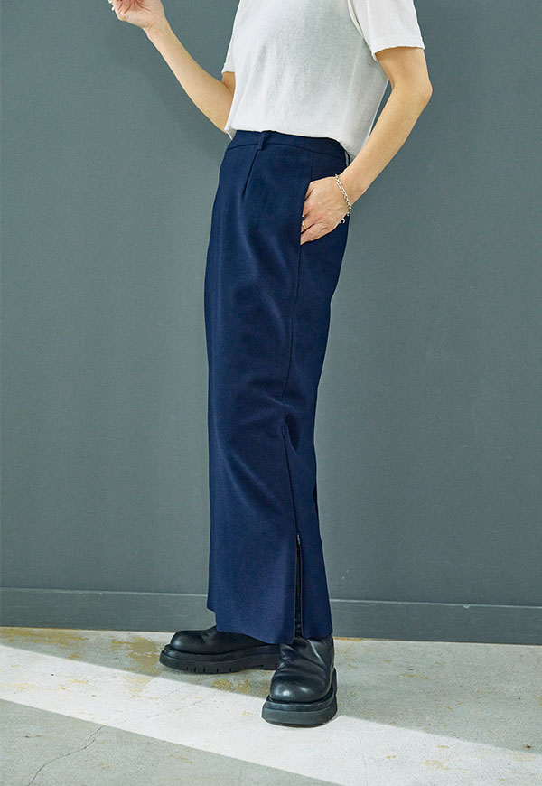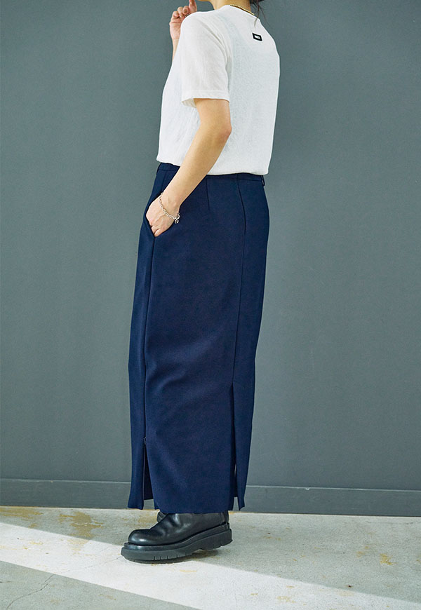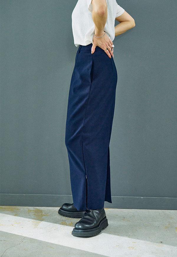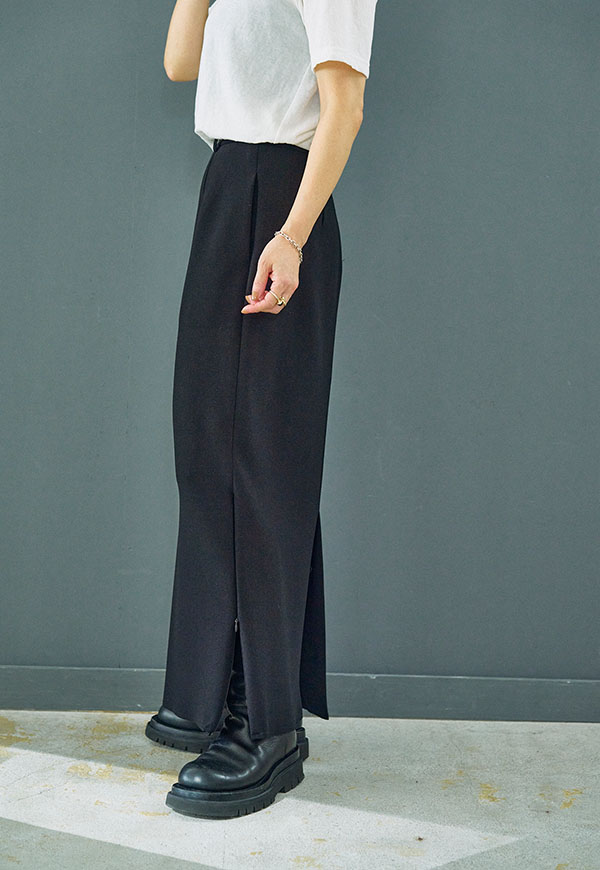 すっきりとしたIラインシルエットに、裾のジップディテールが効いたロングスカートです。