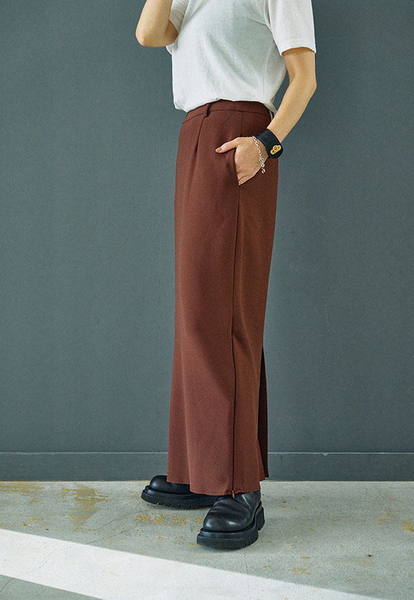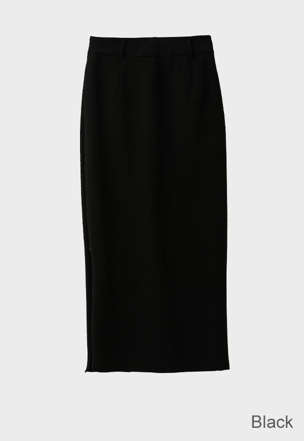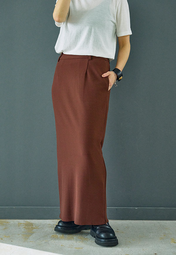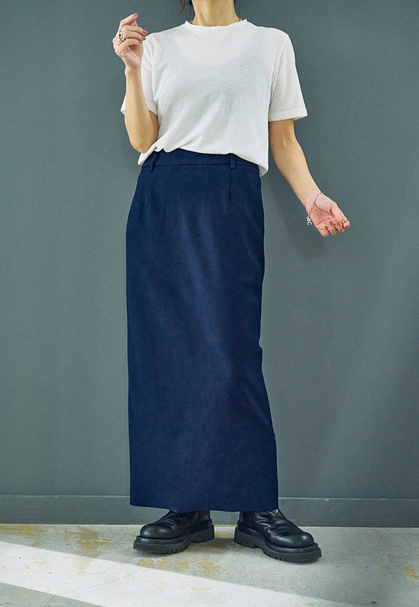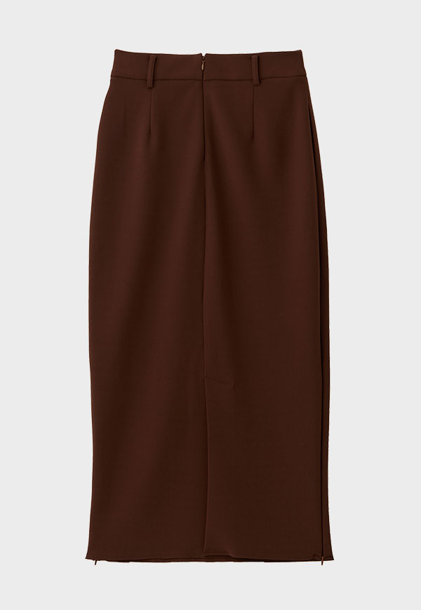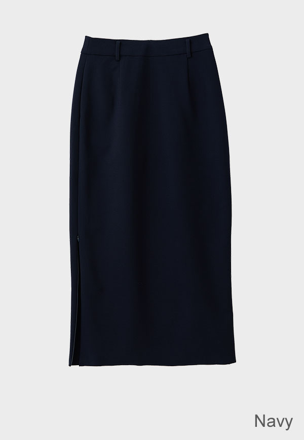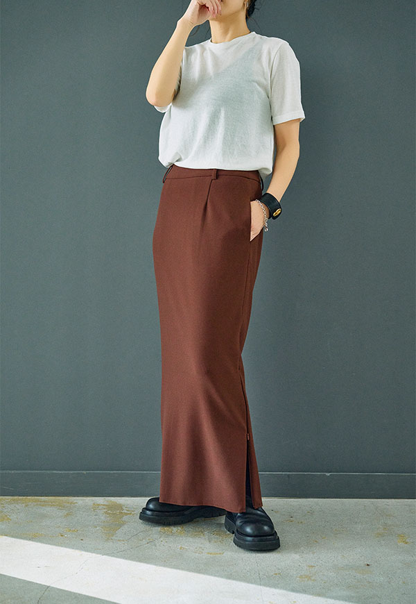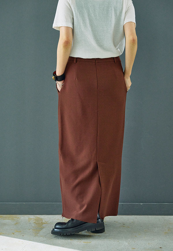 すっきりとしたIラインシルエットに、裾のジップディテールが効いたロングスカートです。