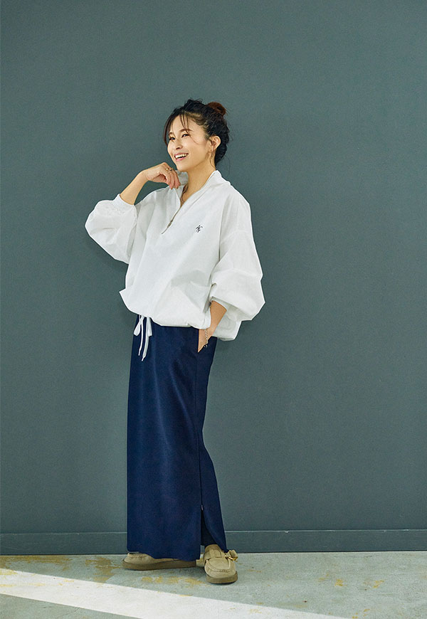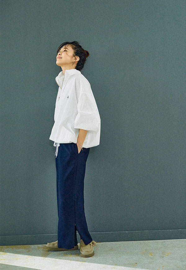 ジップを閉じればタイトなストレートシルエット、開ければ動きやすさと抜け感がプラスされます。