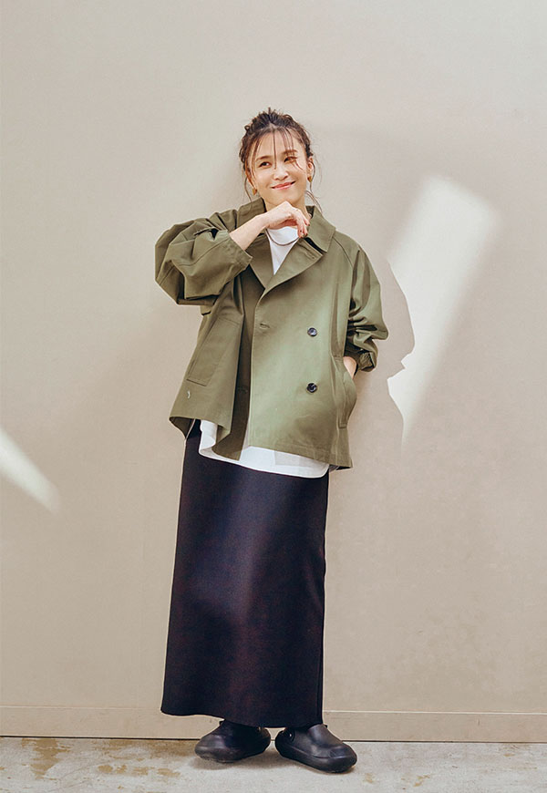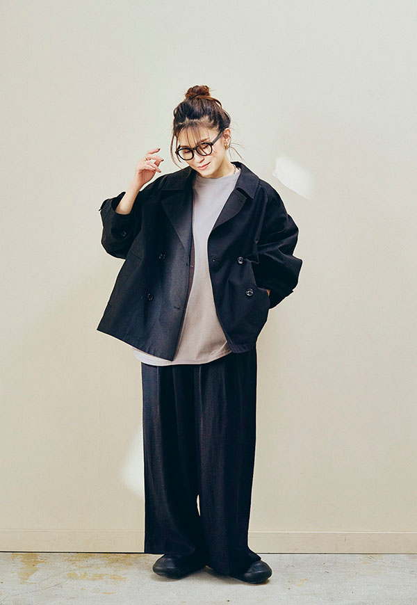 ショート丈なので、パンツにもスカートにもバランス良く合わせられる一着。