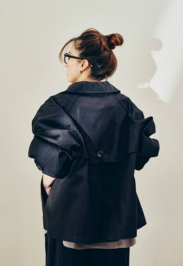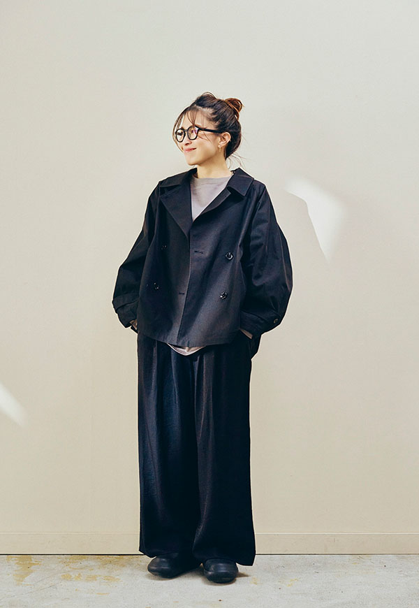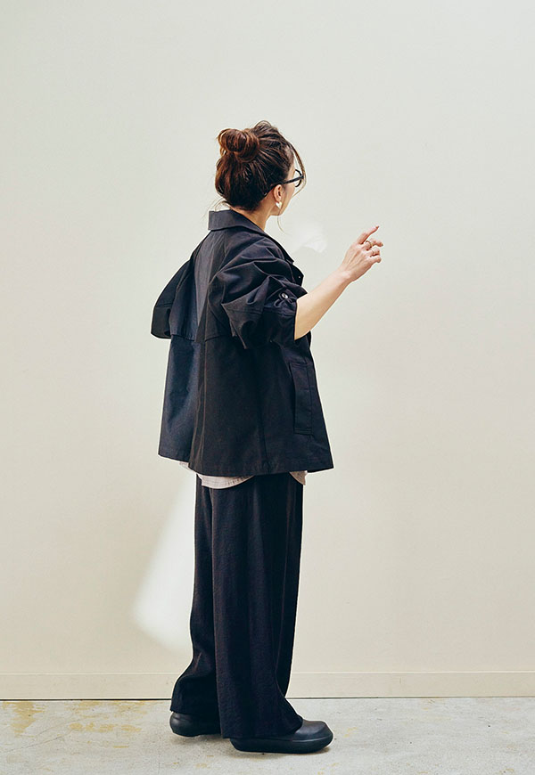 背中のヨークや立体的な袖のフォルムが、シンプルながらも奥行きのあるシルエットを生み出します。