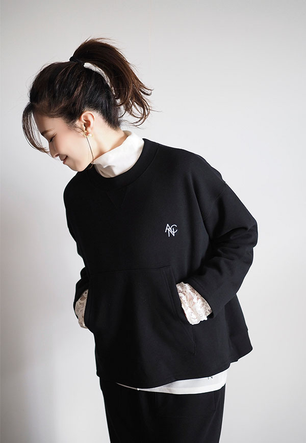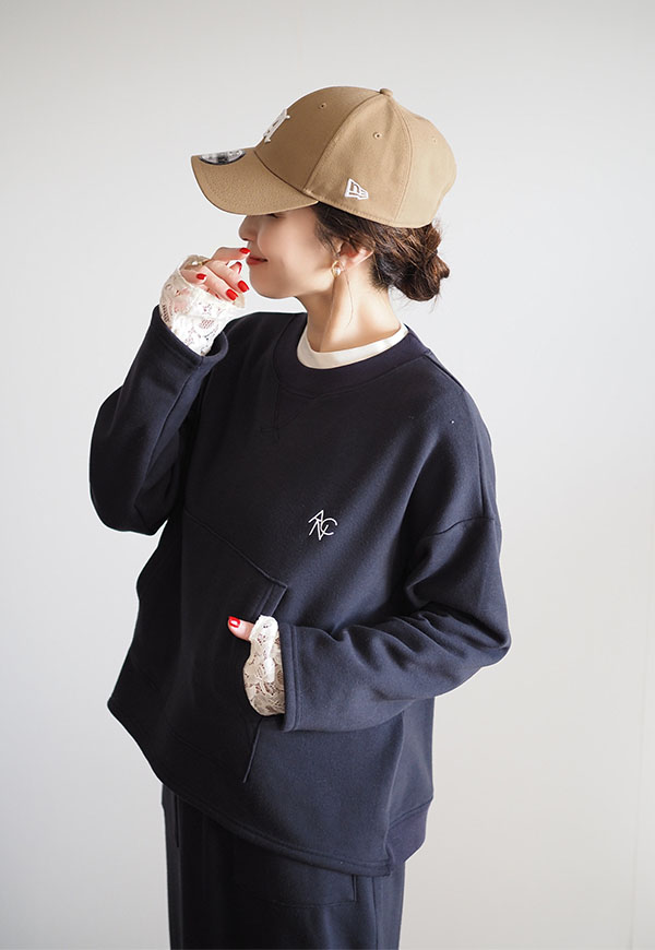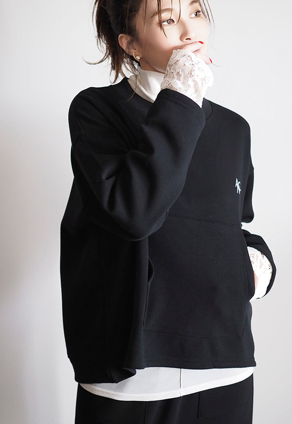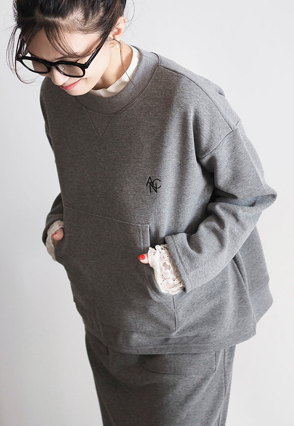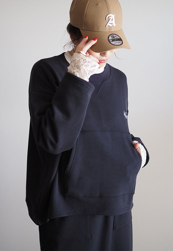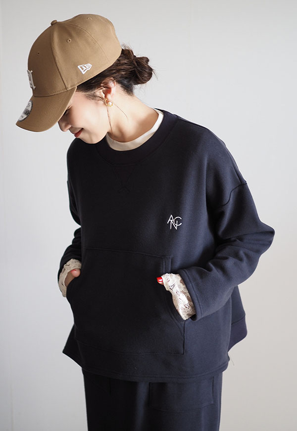パーカーでお馴染みのカンガルーポケットをプルオーバースウェットに配置してポイントにしています。