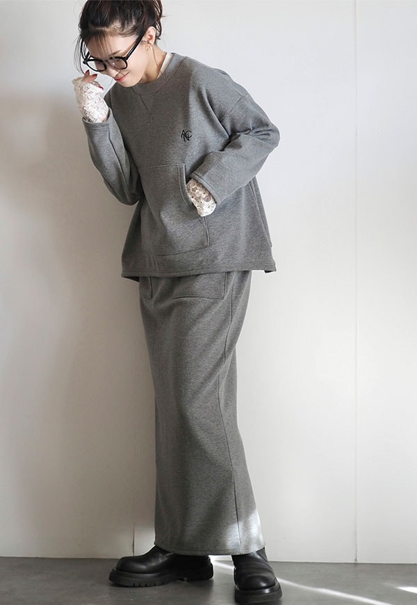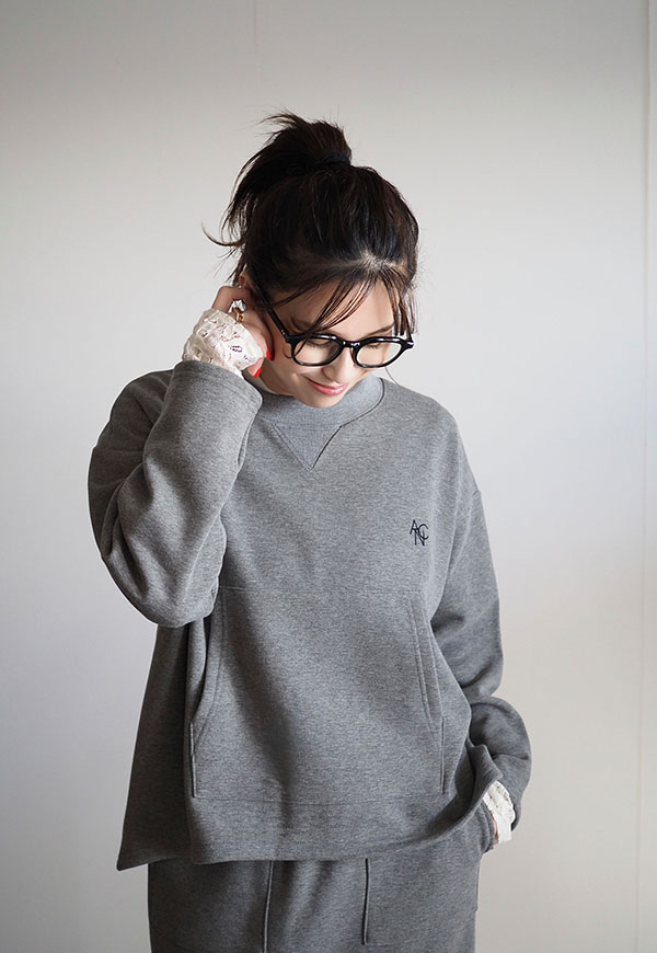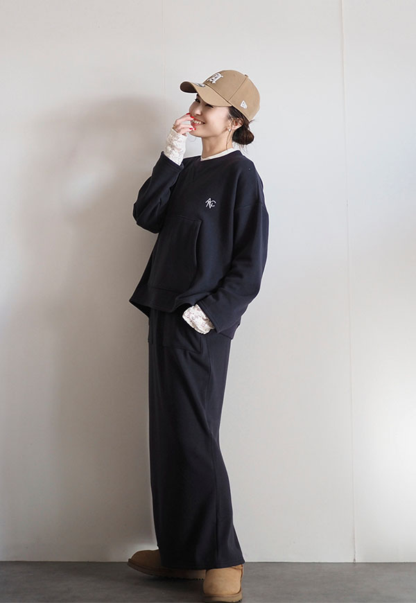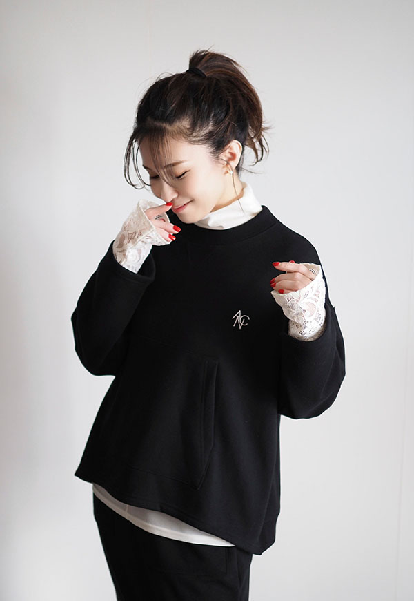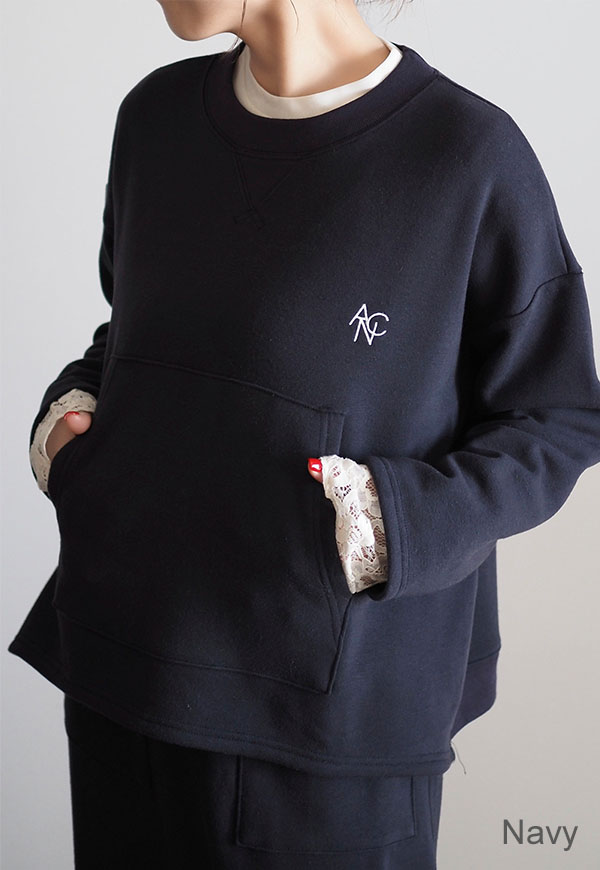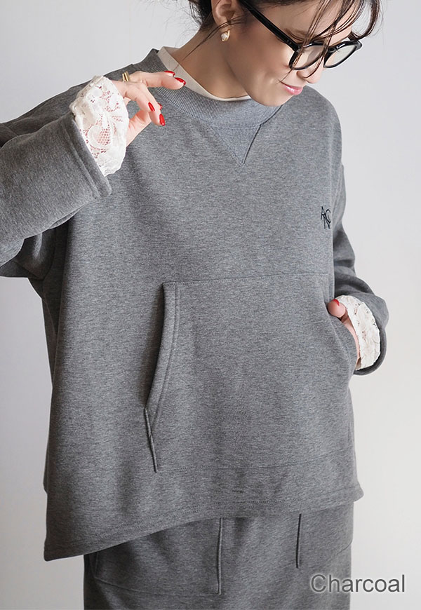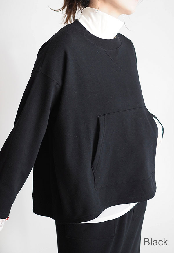 パーカーでお馴染みのカンガルーポケットをプルオーバースウェットに配置してポイントにしています。