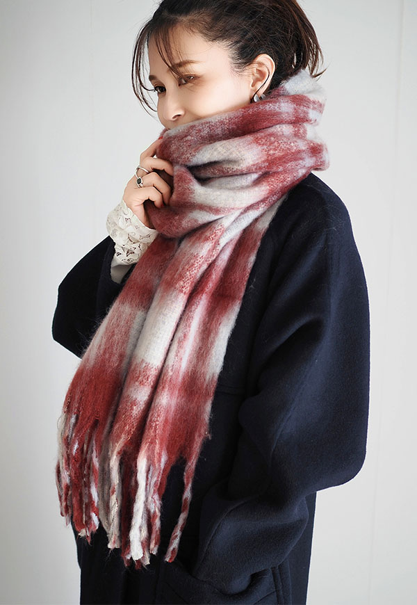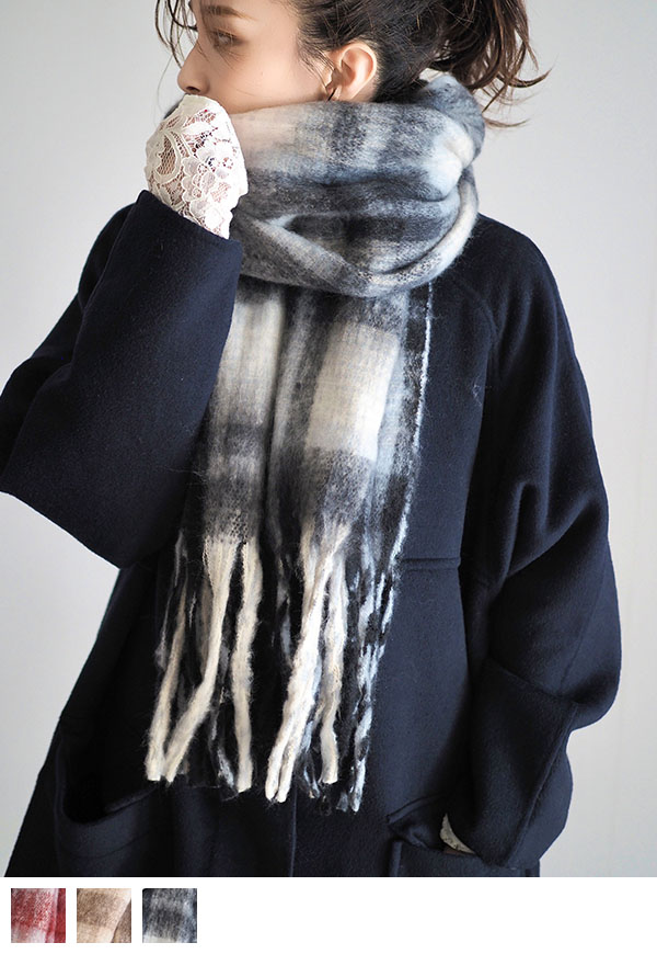 着こなしのアクセントになる、大きなフリンジがアクセントの大判ストールです。