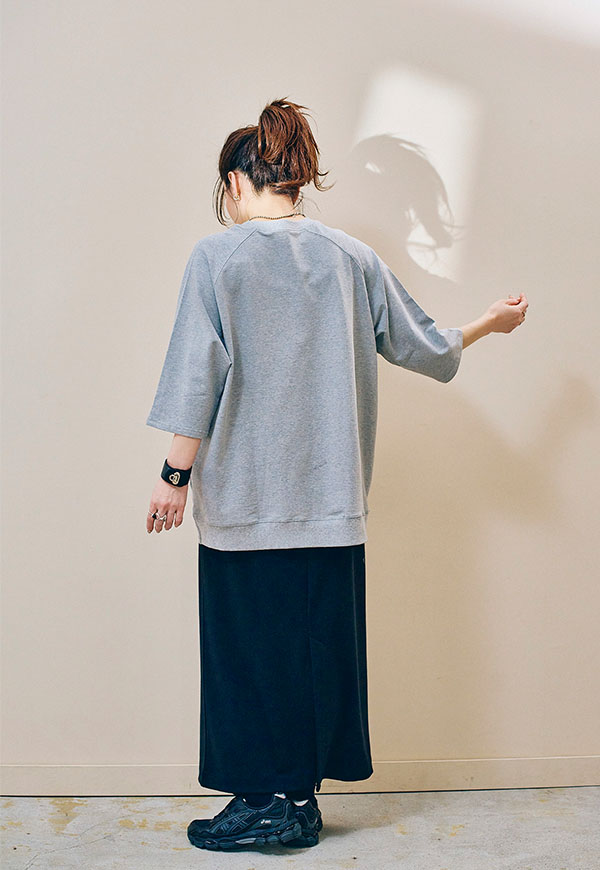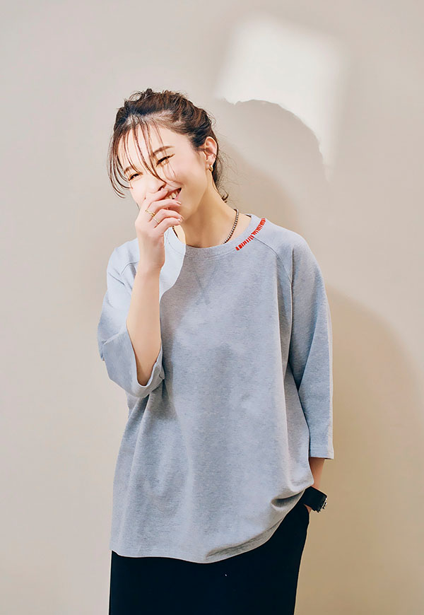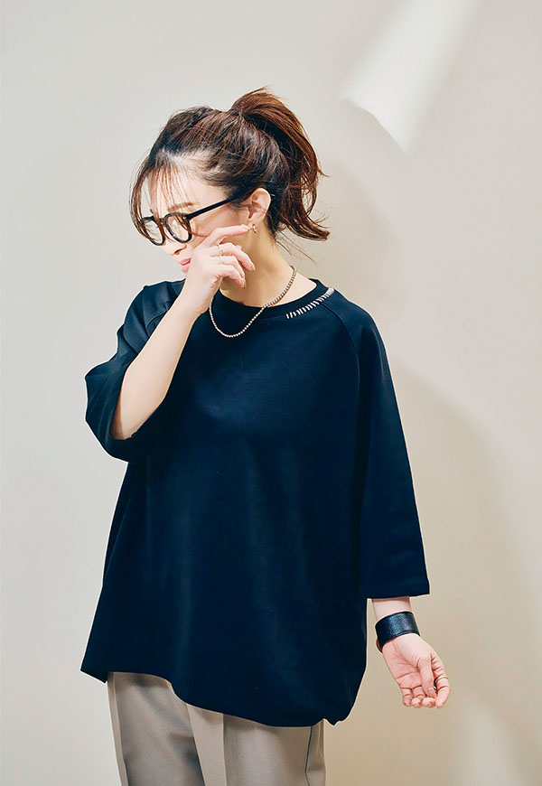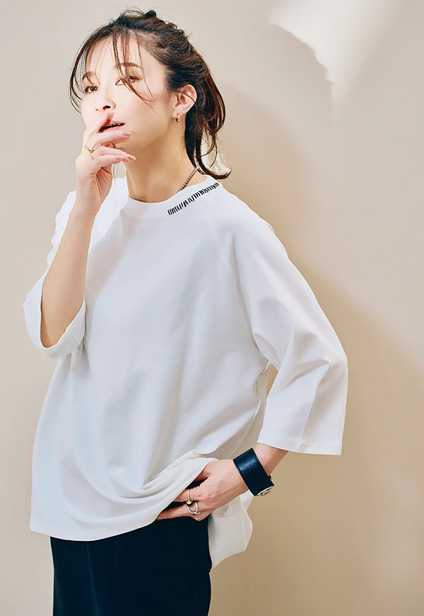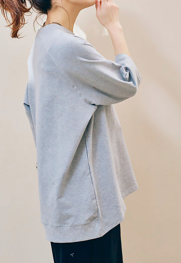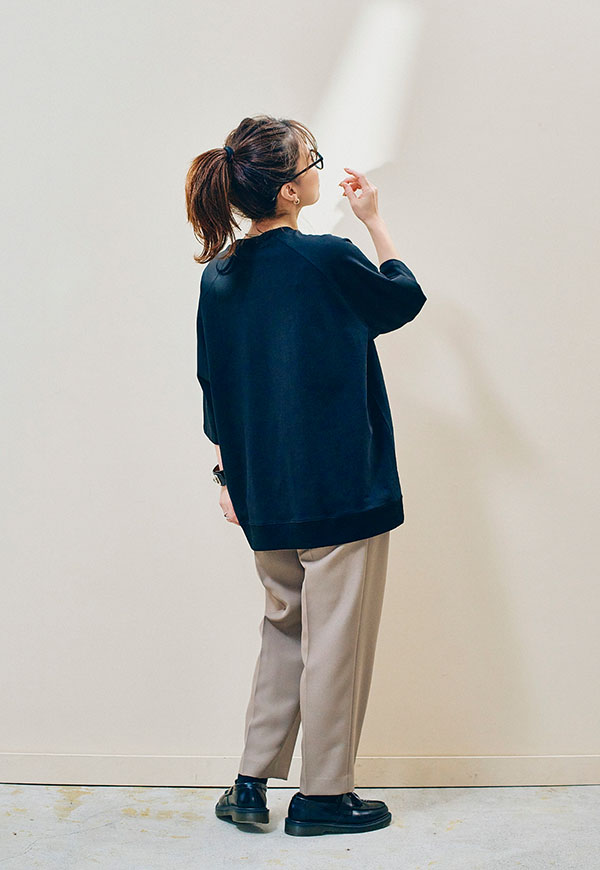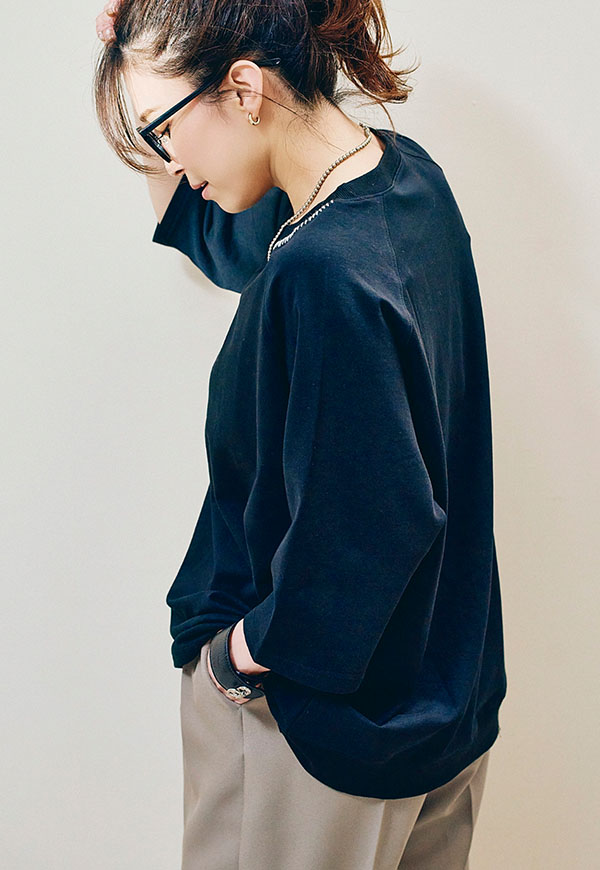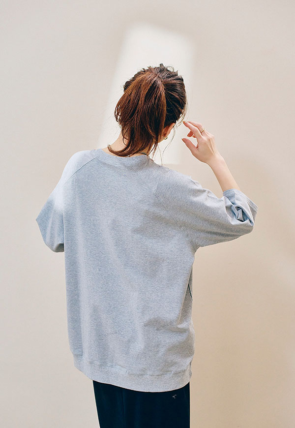 程よくゆとりのあるシルエットとラグランスリーブが、肩まわりを自然にカバーしながら抜け感のある印象に。
