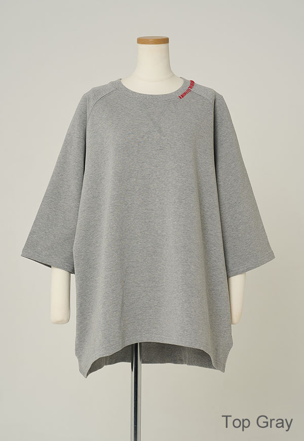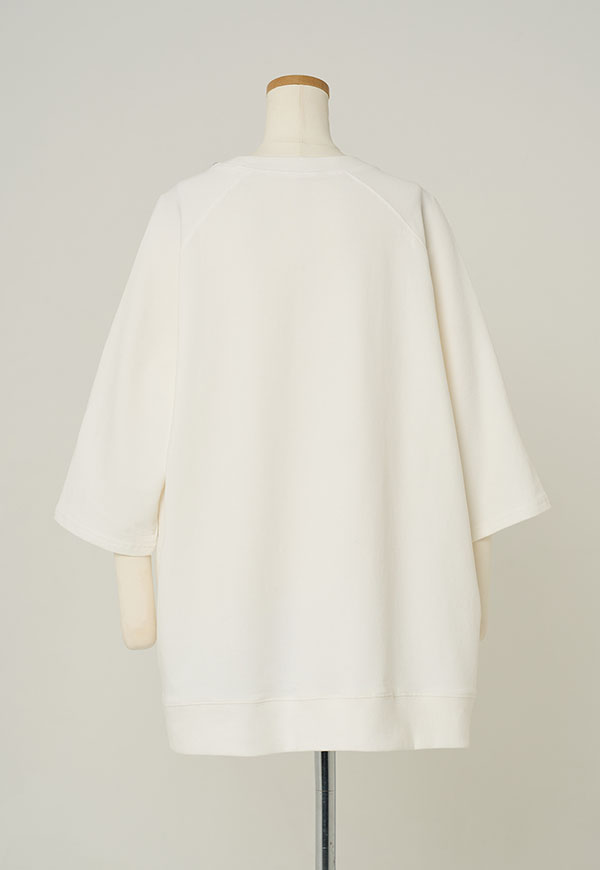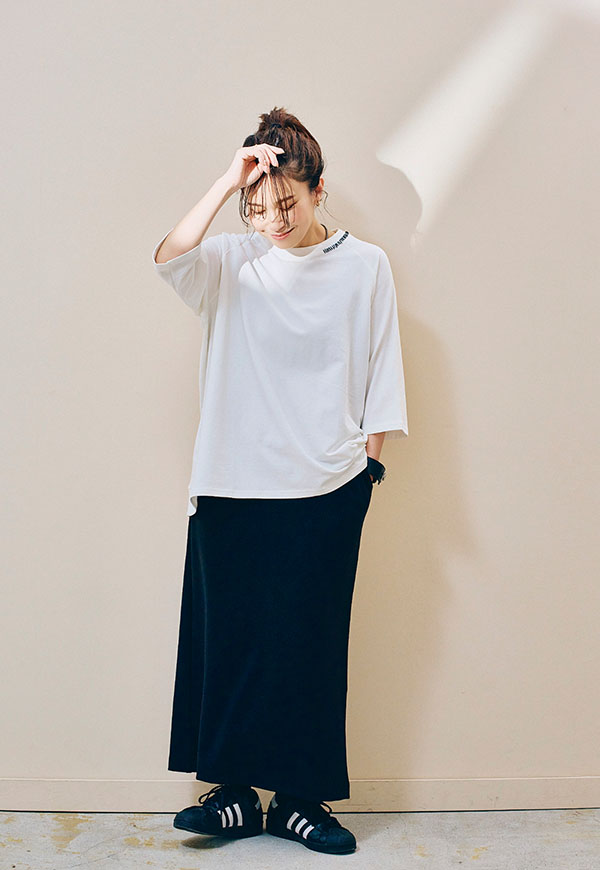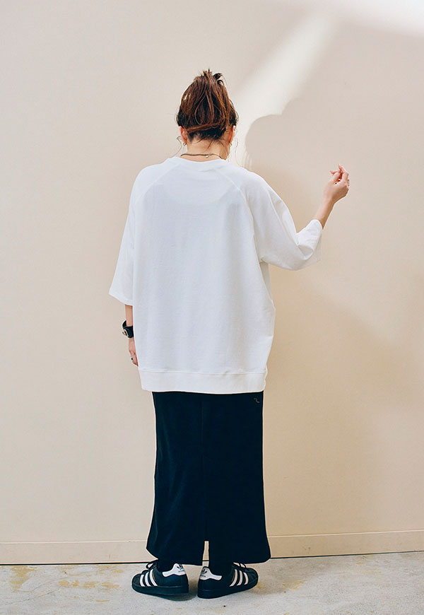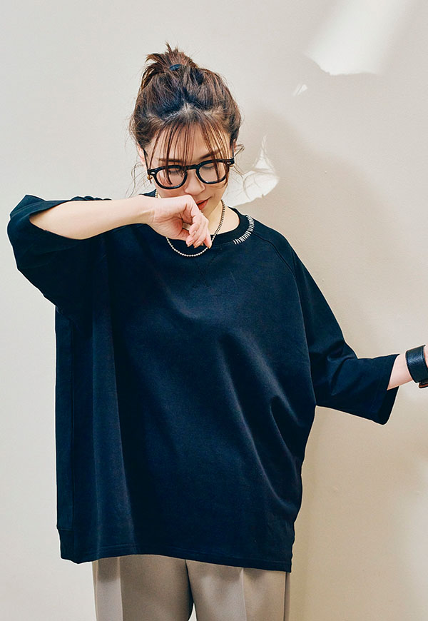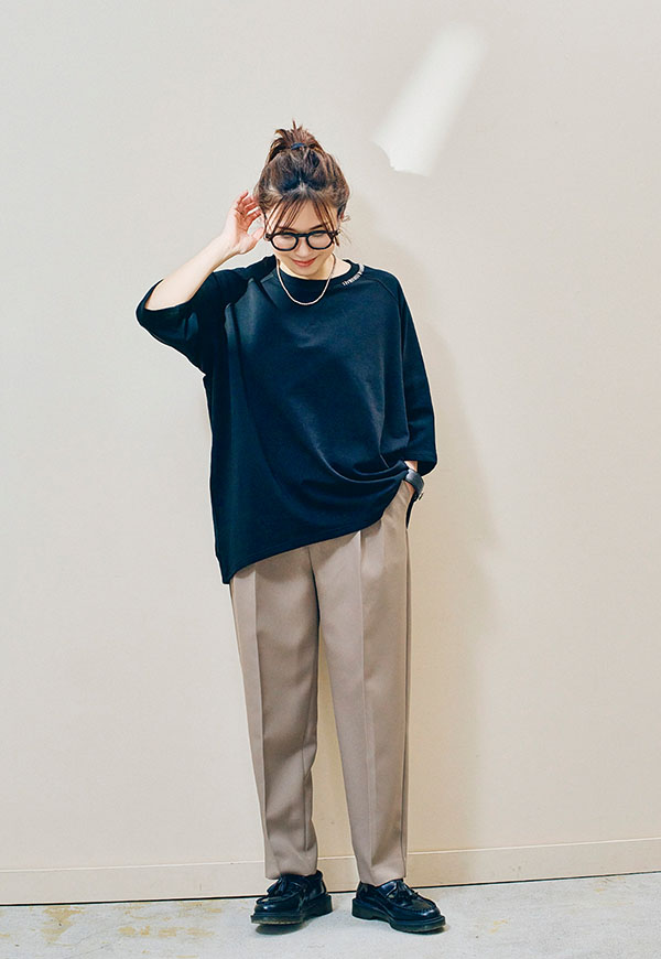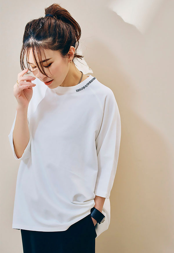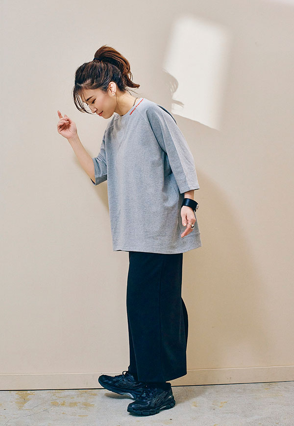 程よくゆとりのあるシルエットとラグランスリーブが、肩まわりを自然にカバーしながら抜け感のある印象に。