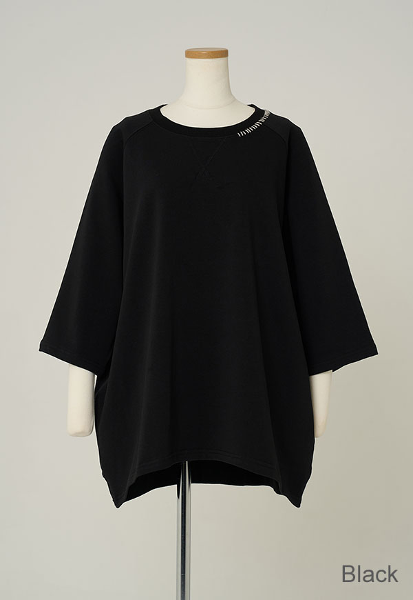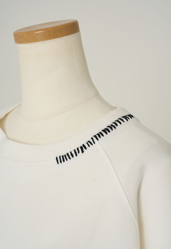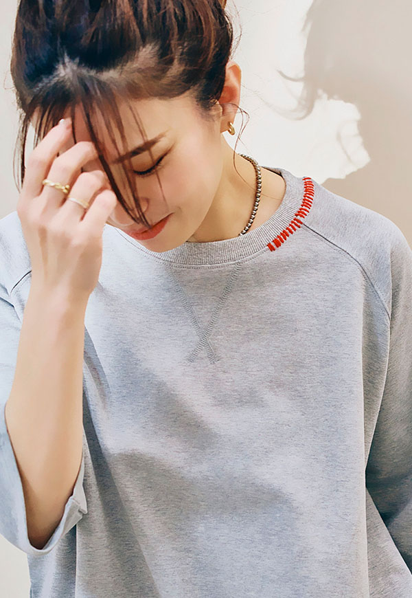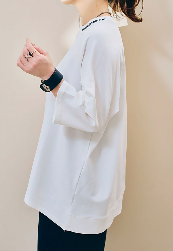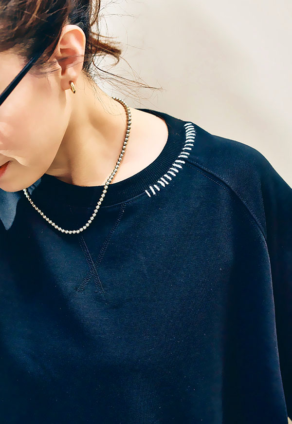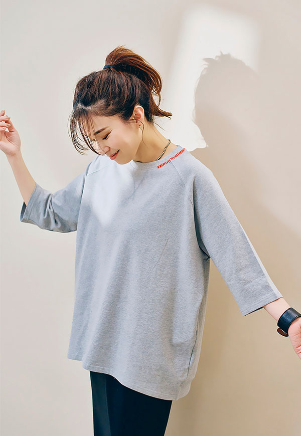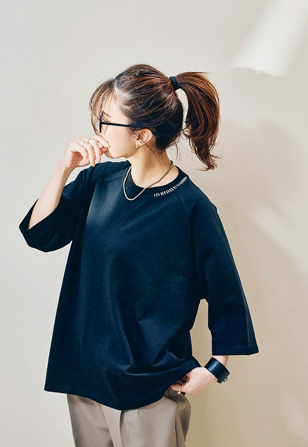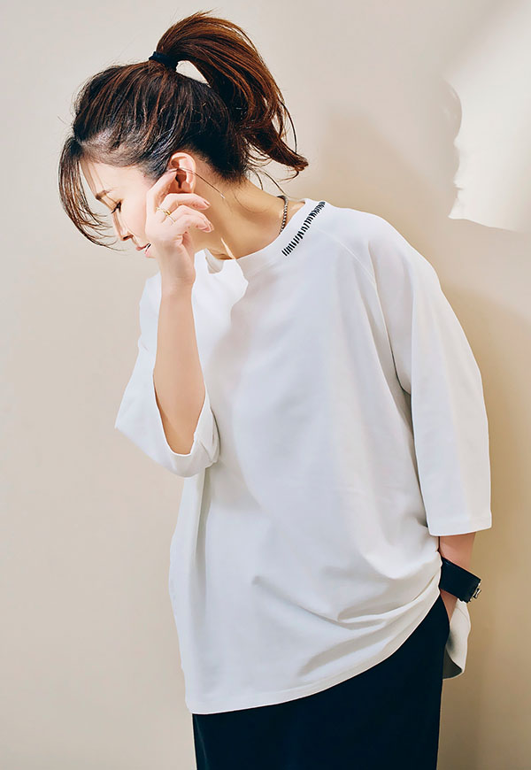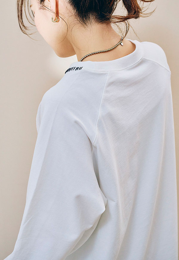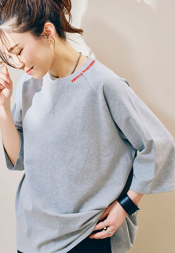 首元に施したステッチデザインがさりげないアクセントになったカットソーです。